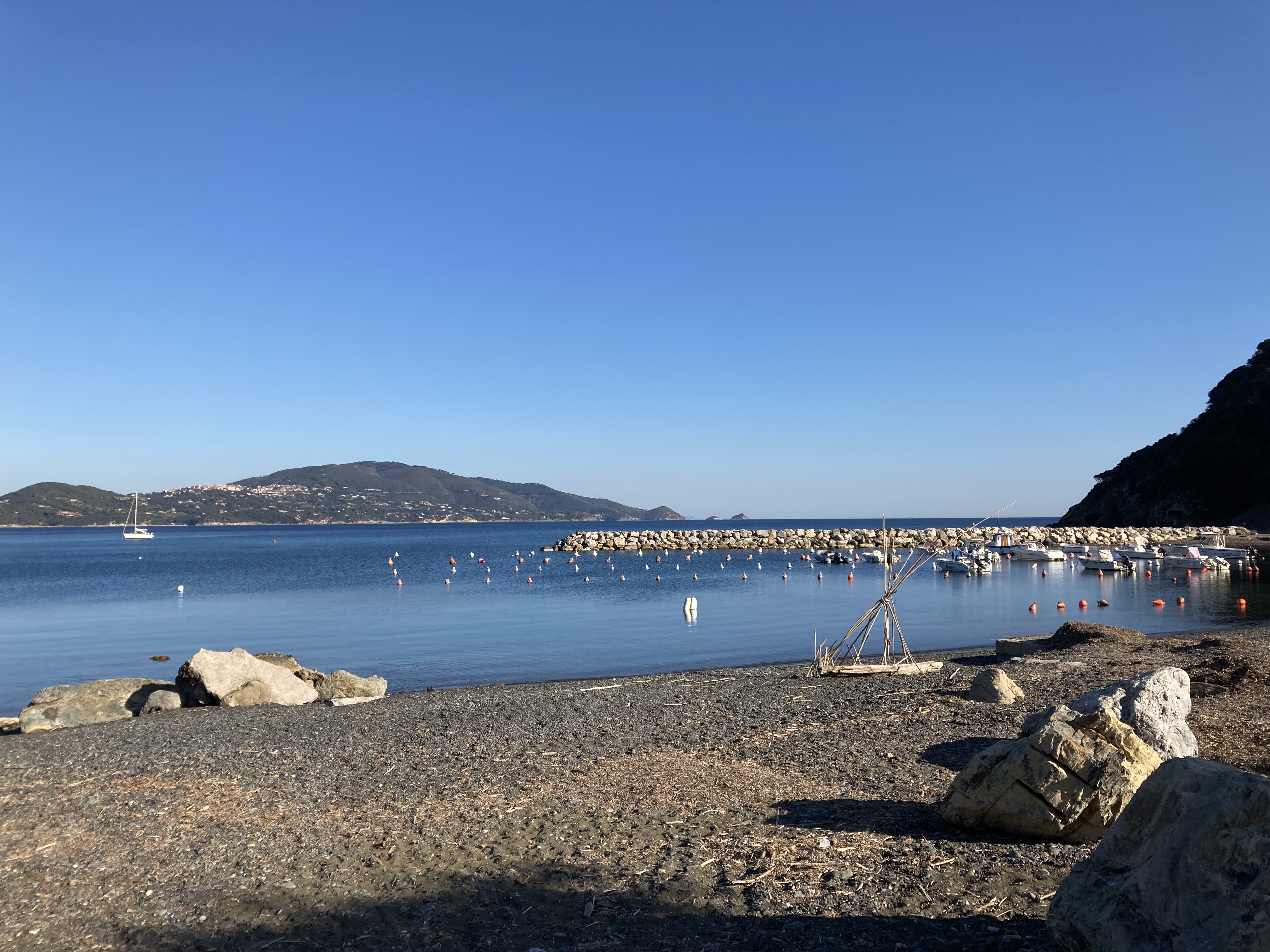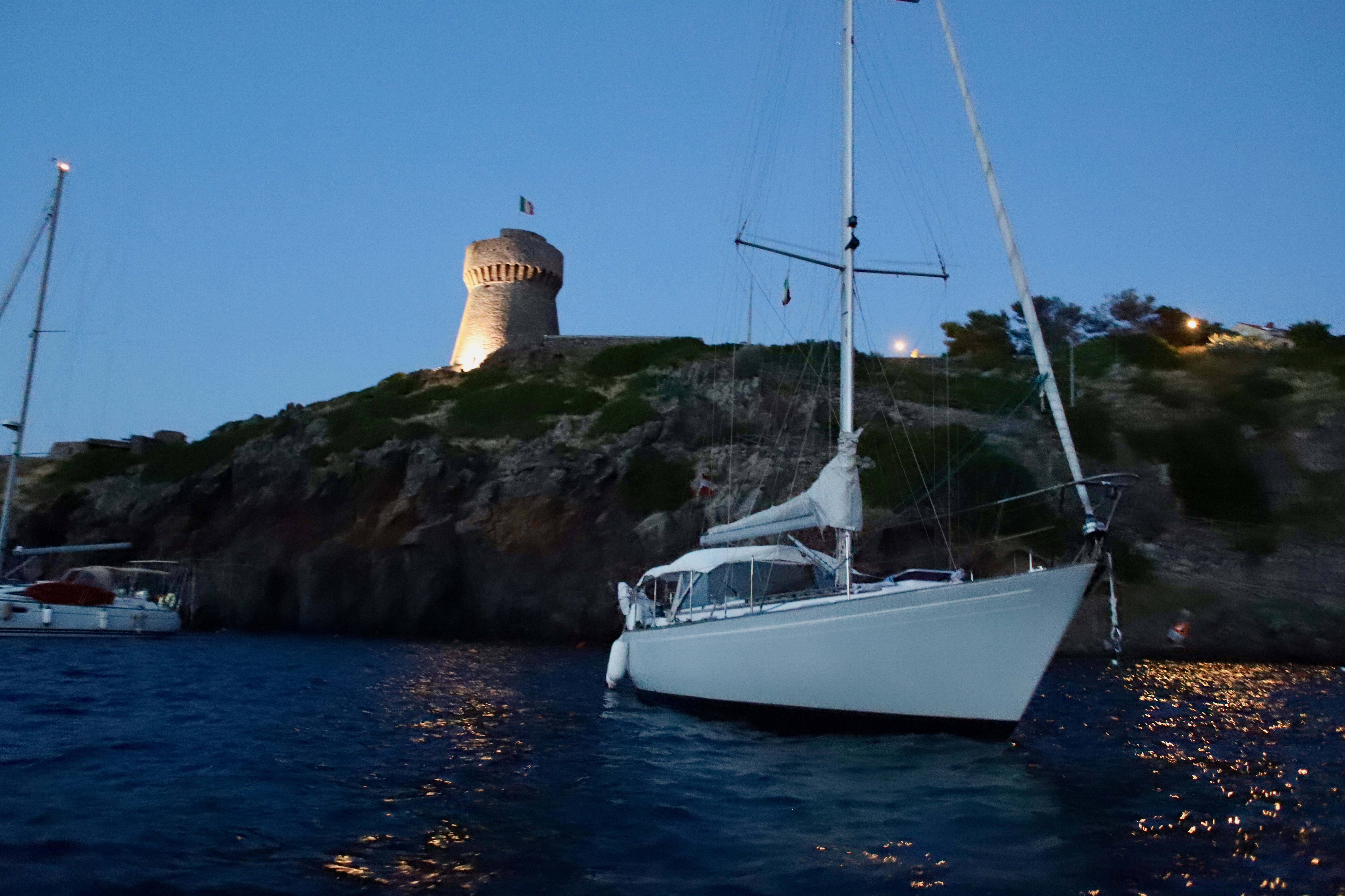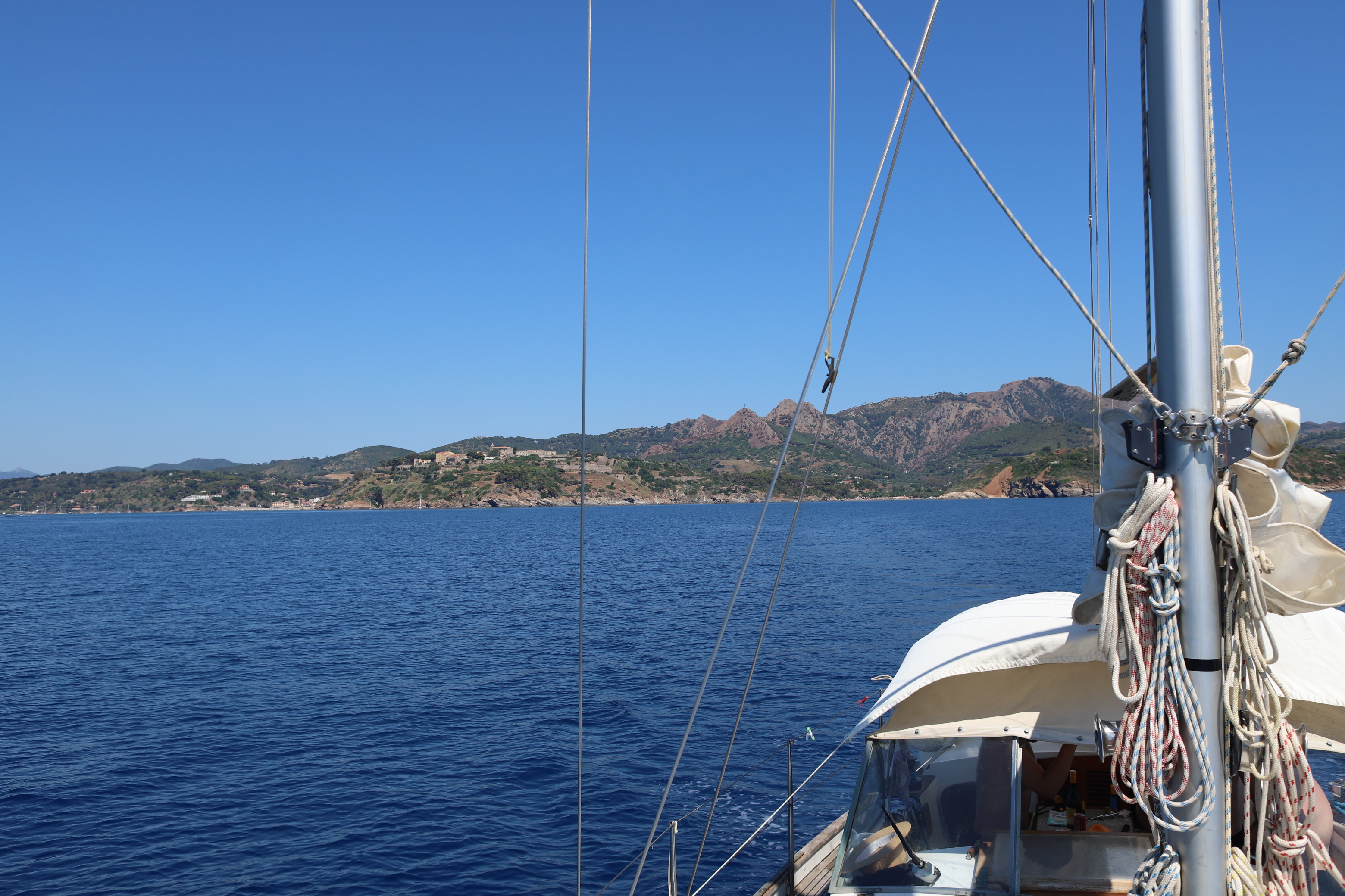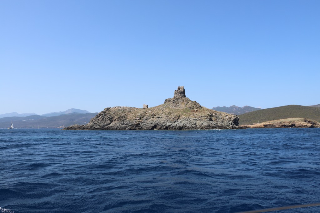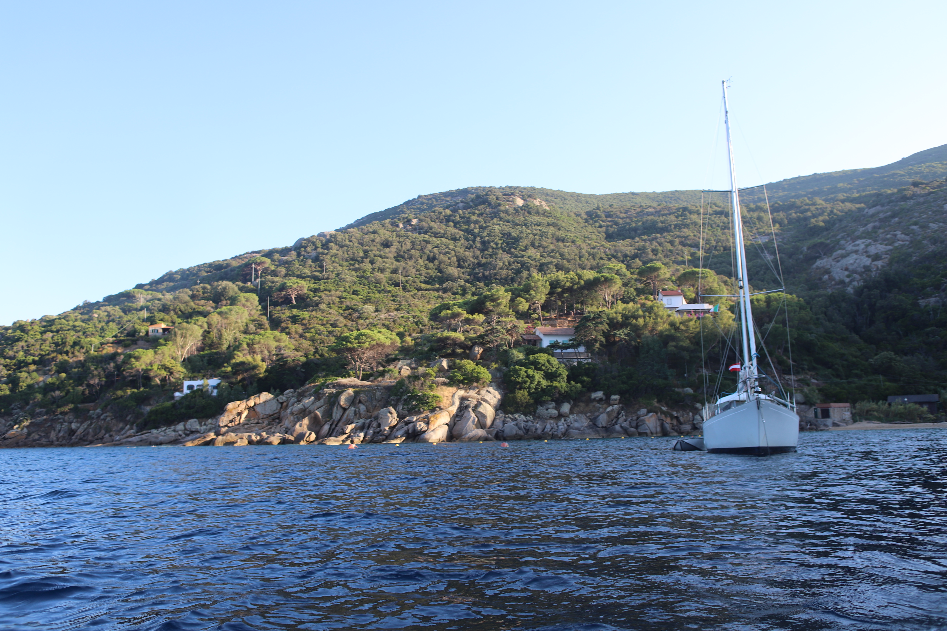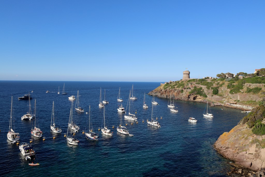 Wir standen drei Tage in einer traumhaften Bucht, der einzigen von Capraia im Nordosten, eine hübsche Einfahrt, ausgeschildert backbords mit einem cubistischen Kastello auf einem Steilfelsen und einem weiß getünchten Leuchtturm. Um die Ecke wirds etwas flacher, mit Steinen, Mauern, Beflanzungen kultiviert und mit einem Weg nach oben bis zu einem Torre. Da ist er wieder, dieser vertraute harzhaltige Geruch nach Zitrone irgendwie, aber auch nach Wein, Thymian oder Salbei. Blöderweise drängen beim Einlaufen in die Bucht zwei kürzere Hafenmolen ins Auge, so hoch aufragende Biester aus riesigen Steinen – aber – wer kann es den wenigen Einheimischen verdenken, wenn sechs Monate im Jahr schwere Brecher und Sturm die Beckdecken befeuchteln?