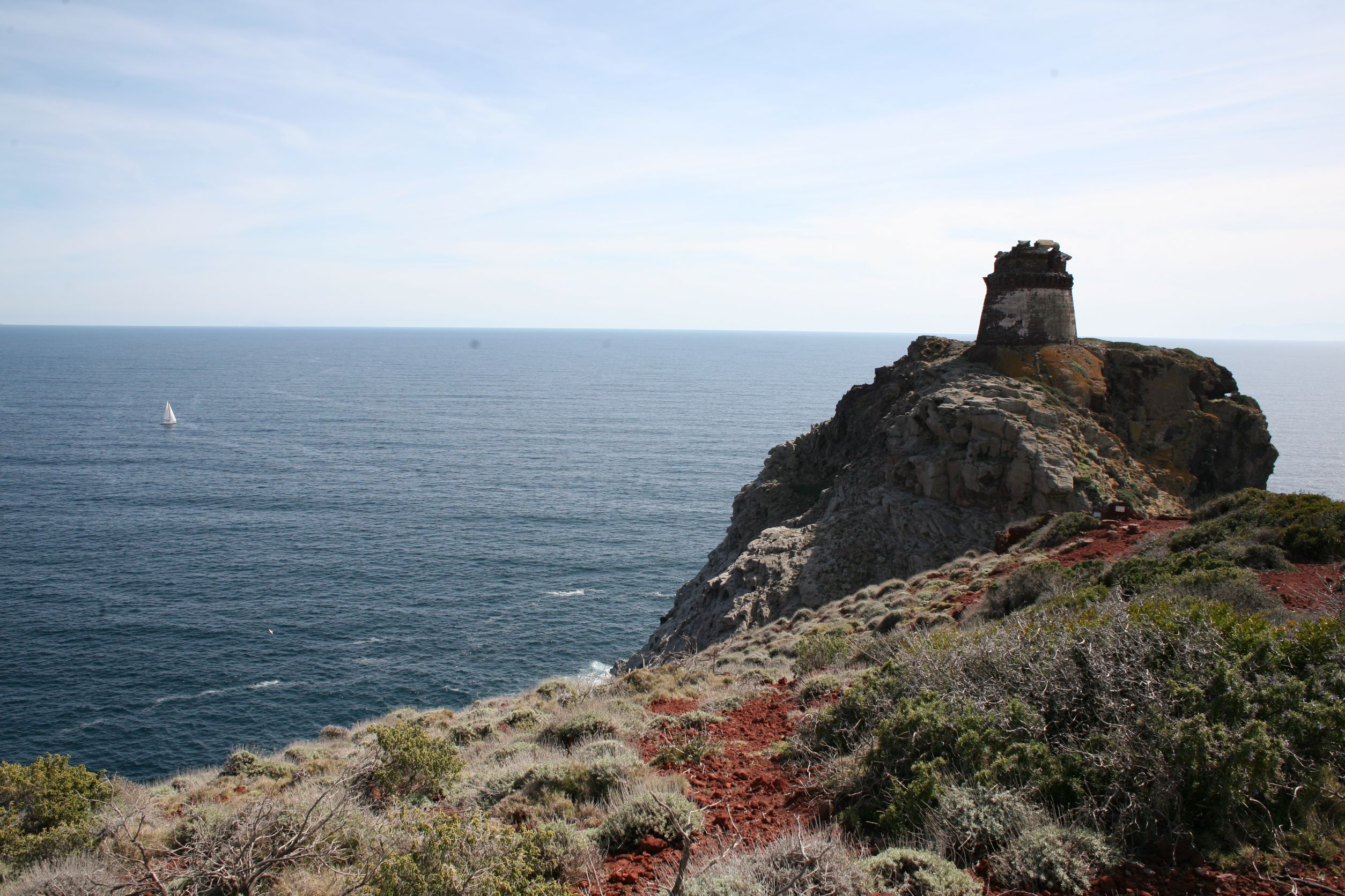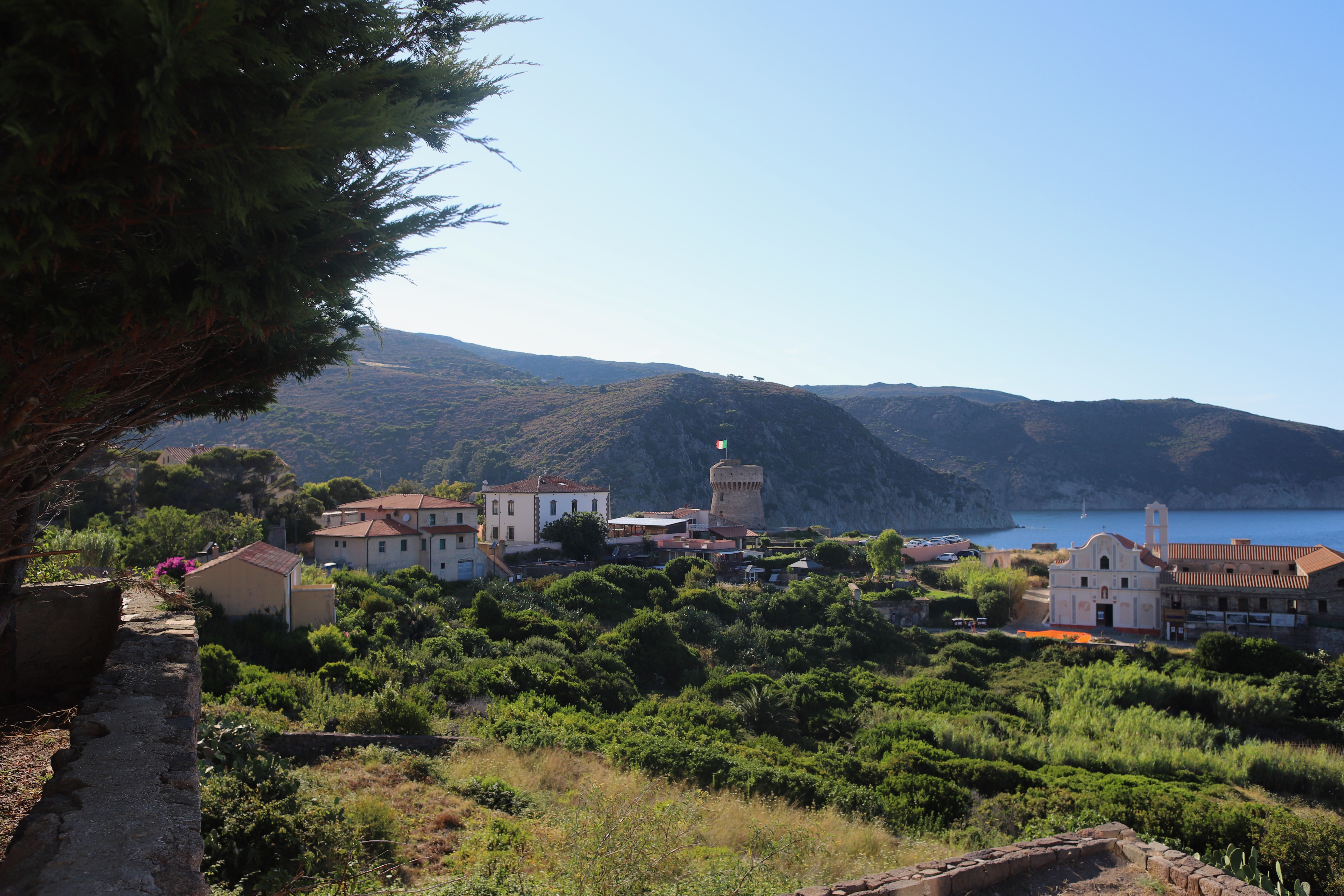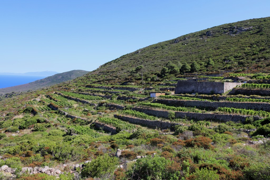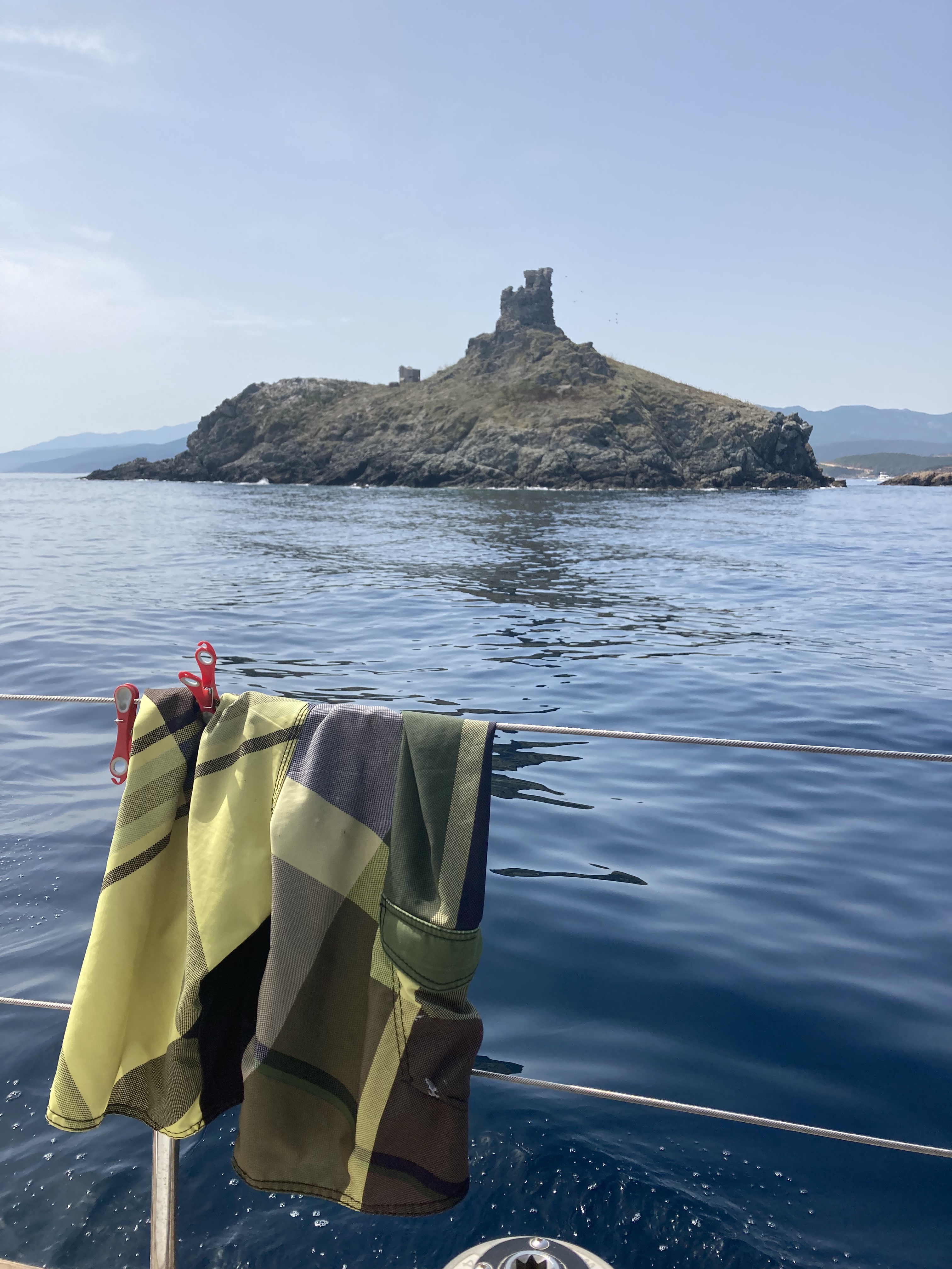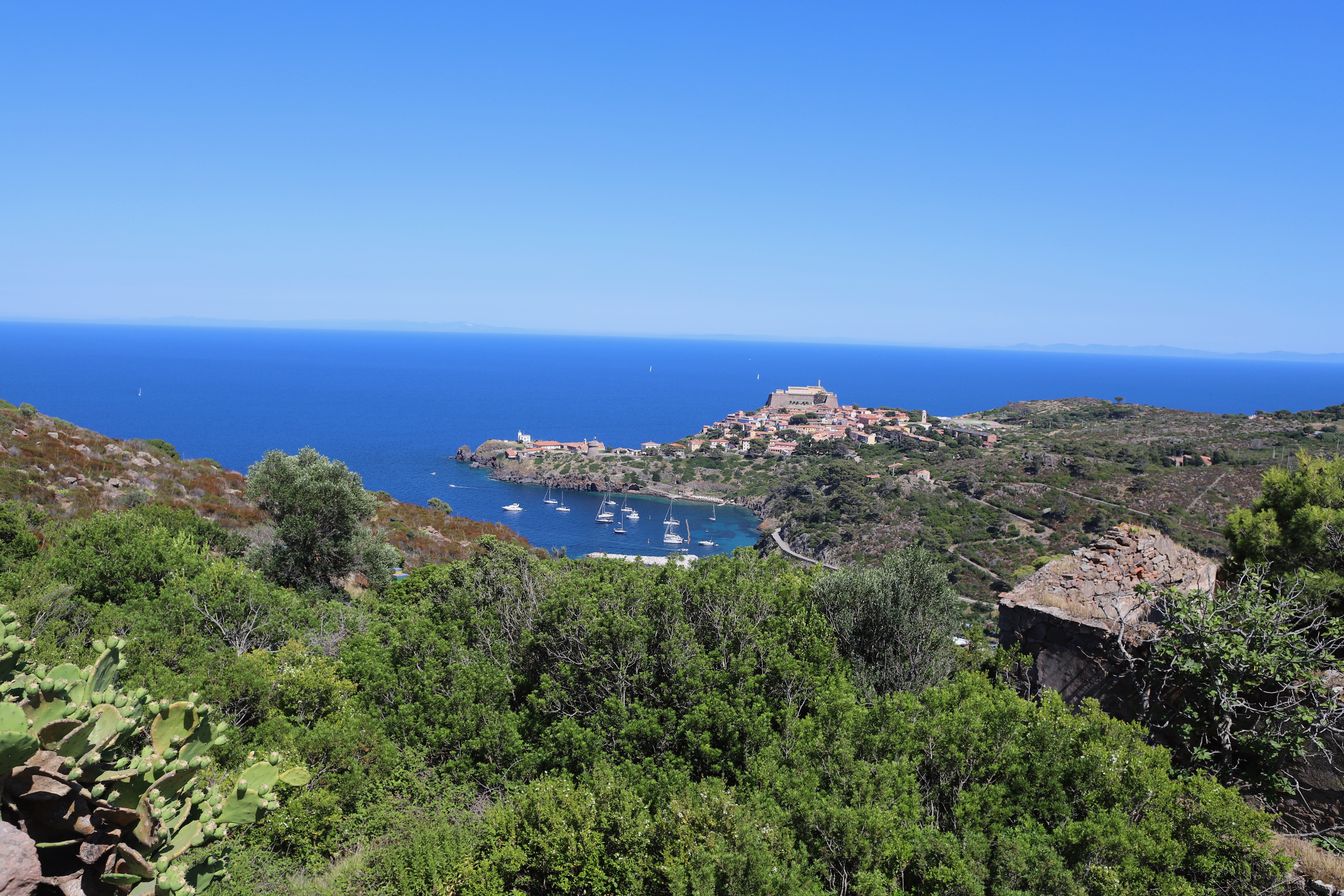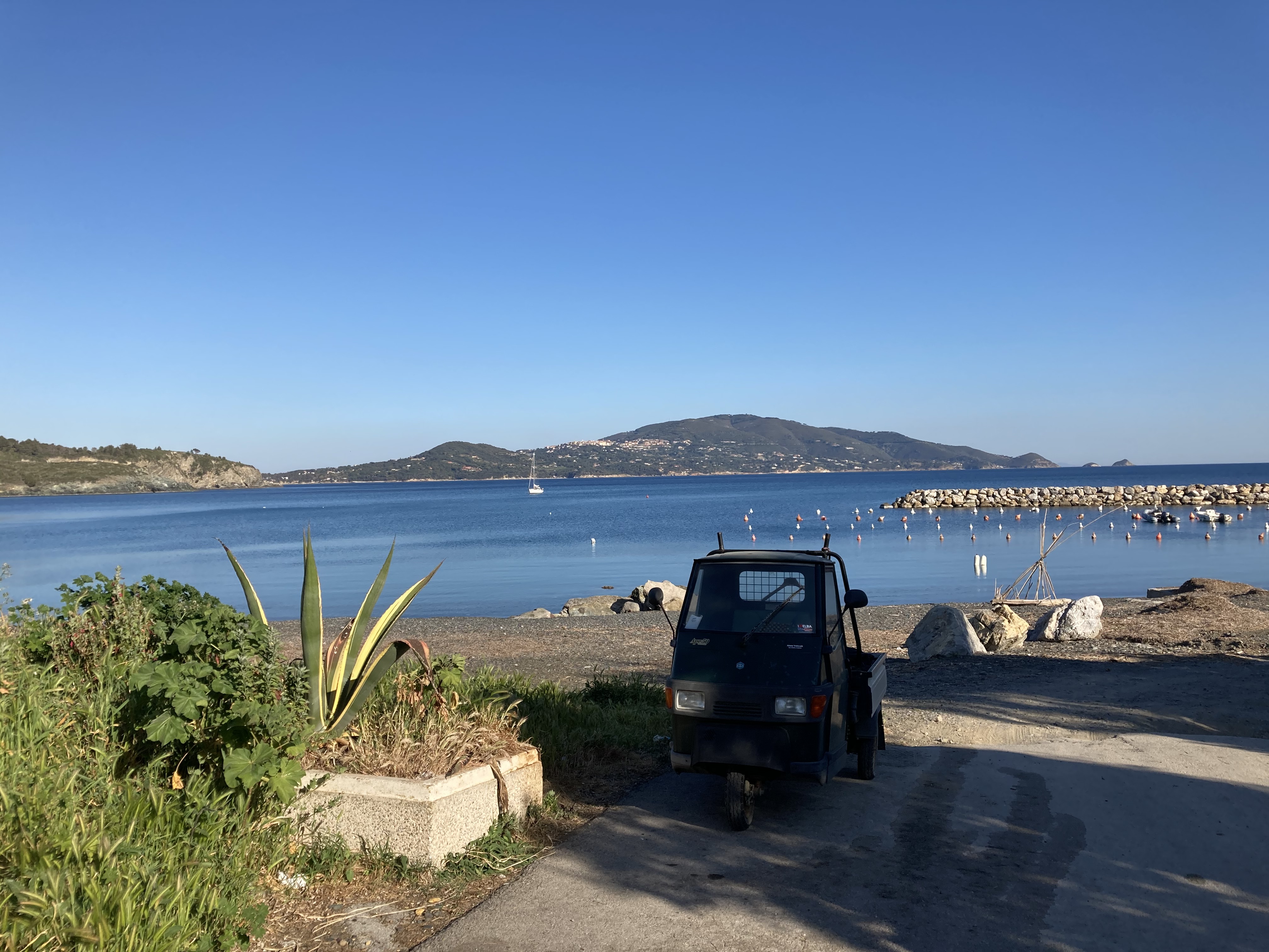 Wir standen drei Tage in einer traumhaften Bucht, der einzigen von Capraia im Nordosten, eine hübsche Einfahrt, ausgeschildert backbords mit einem cubistischen Kastello auf einem Steilfelsen und einem weiß getünchten Leuchtturm. Um die Ecke wirds etwas flacher, mit Steinen, Mauern, Beflanzungen kultiviert und mit einem Weg nach oben bis zu einem Torre. Da ist er wieder, dieser vertraute harzhaltige Geruch nach Zitrone irgendwie, aber auch nach Wein, Thymian oder Salbei. Blöderweise drängen beim Einlaufen in die Bucht zwei kürzere Hafenmolen ins Auge, so hoch aufragende Biester aus riesigen Steinen – aber – wer kann es den wenigen Einheimischen verdenken, wenn sechs Monate im Jahr schwere Brecher und Sturm die Beckdecken befeuchteln?