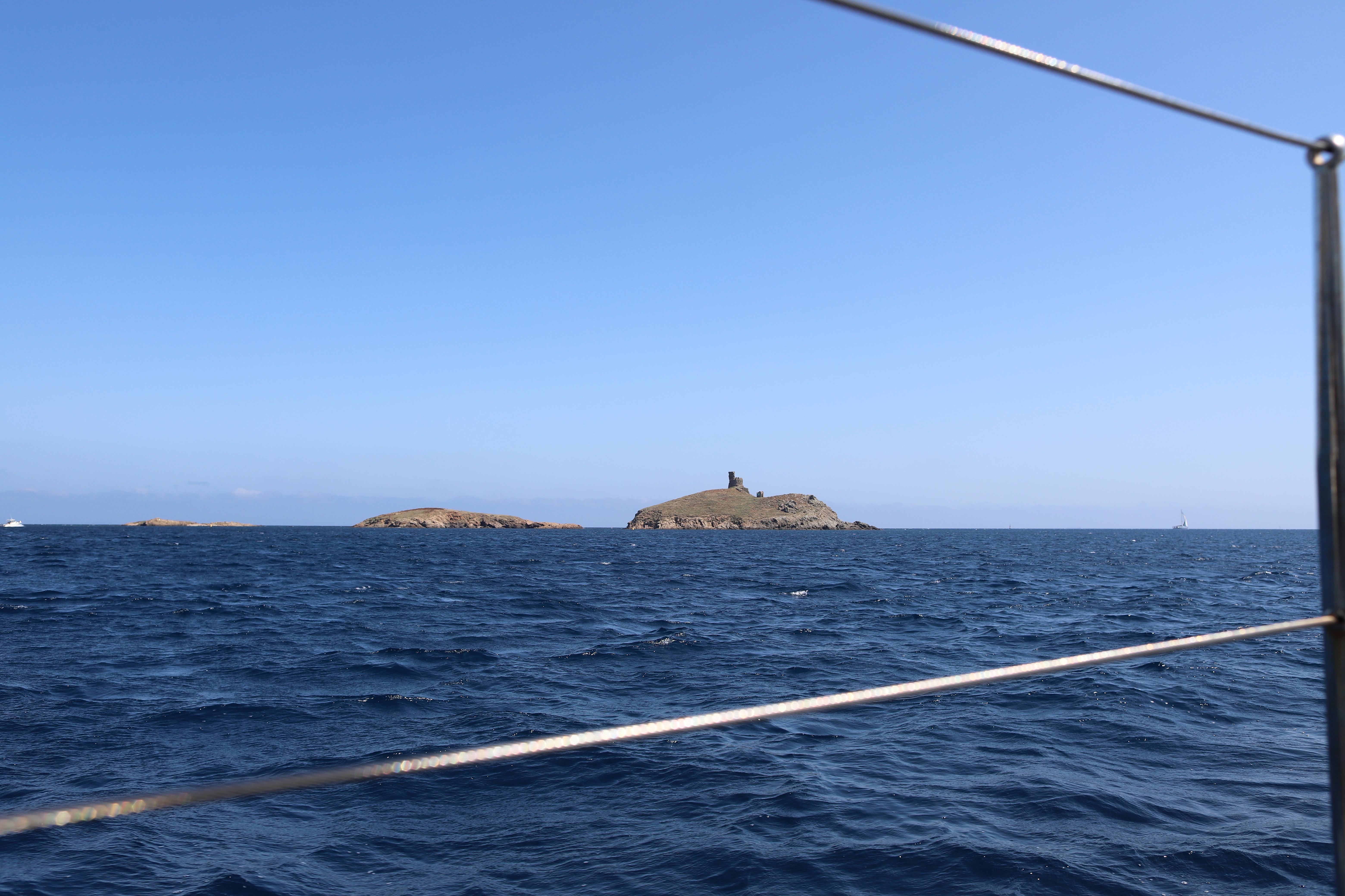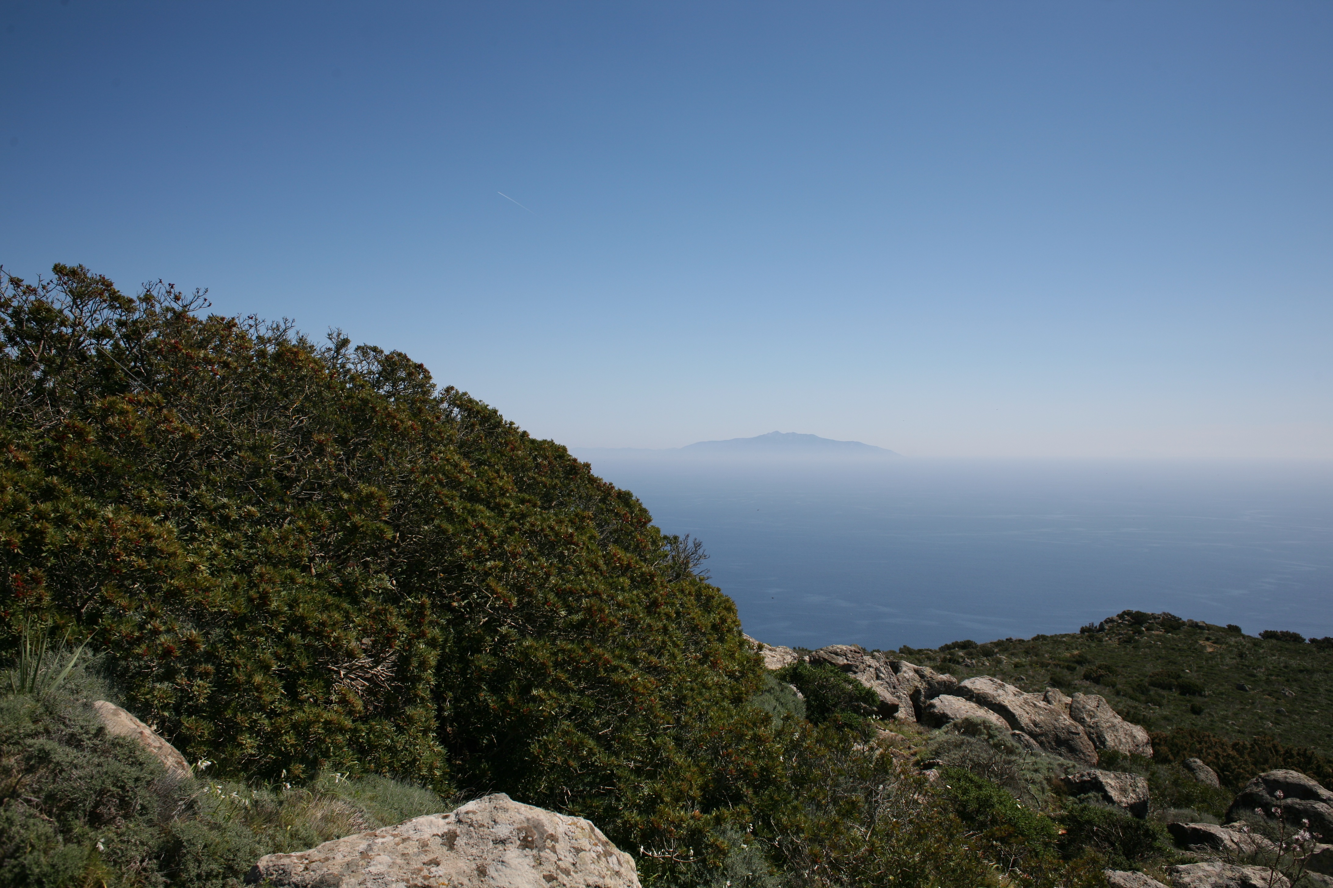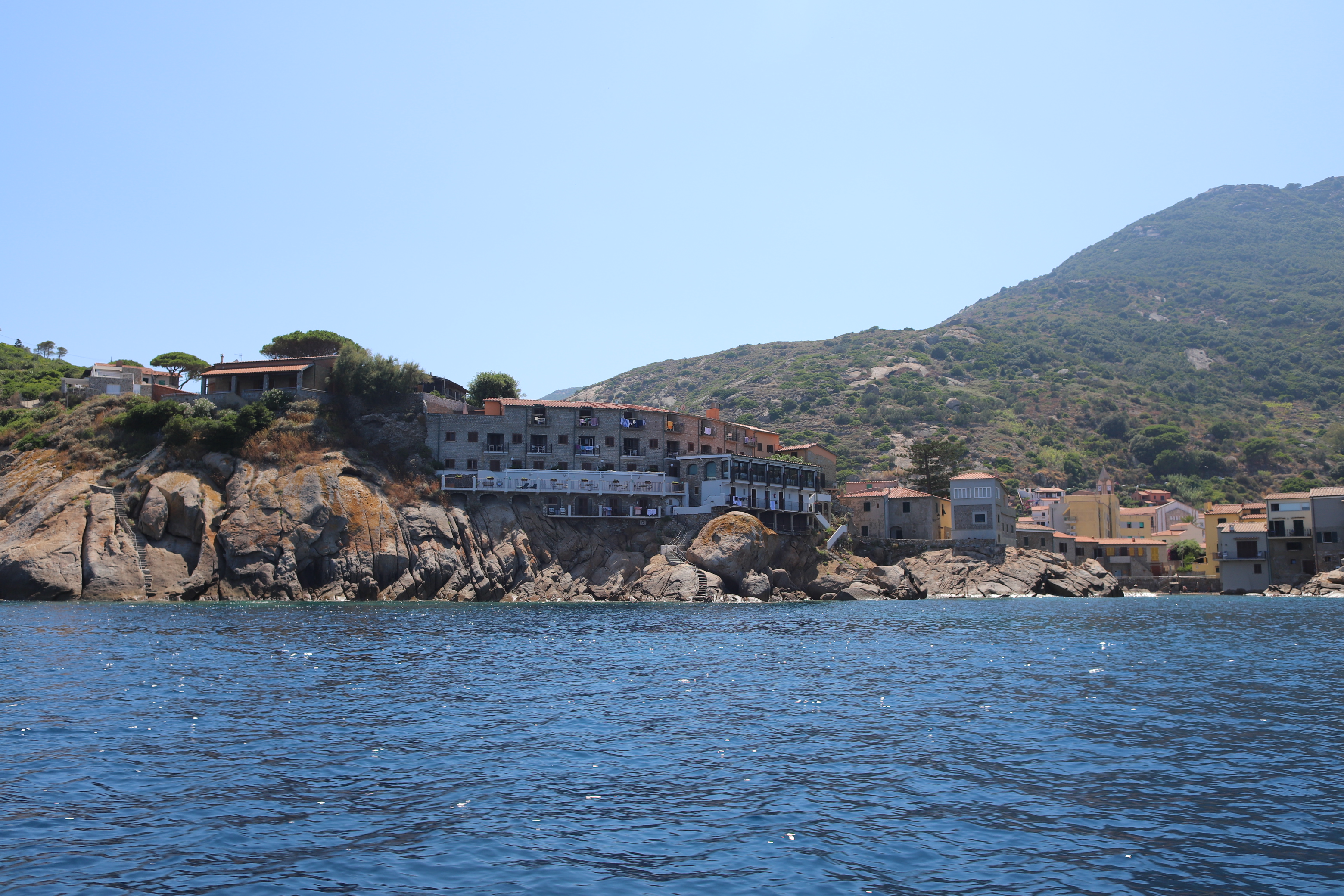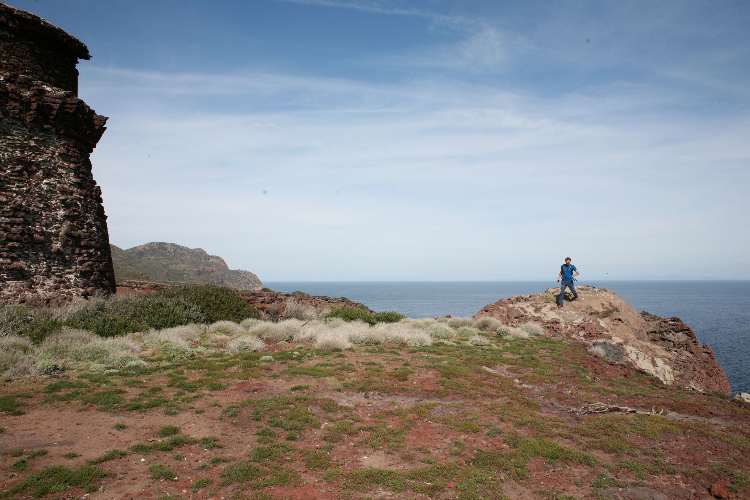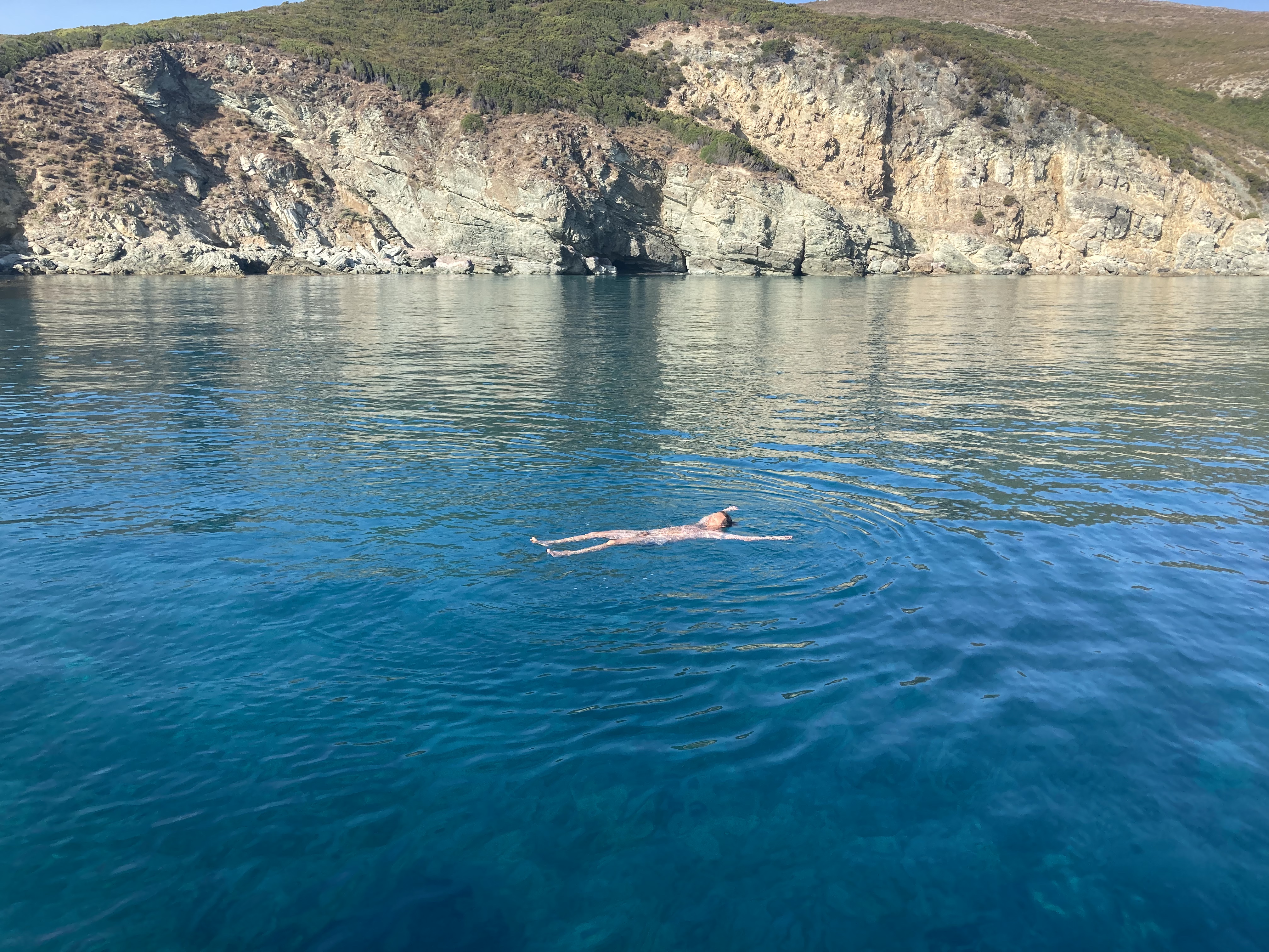 Wir standen drei Tage in einer traumhaften Bucht, der einzigen von Capraia im Nordosten, eine hübsche Einfahrt, ausgeschildert backbords mit einem cubistischen Kastello auf einem Steilfelsen und einem weiß getünchten Leuchtturm. Um die Ecke wirds etwas flacher, mit Steinen, Mauern, Beflanzungen kultiviert und mit einem Weg nach oben bis zu einem Torre. Da ist er wieder, dieser vertraute harzhaltige Geruch nach Zitrone irgendwie, aber auch nach Wein, Thymian oder Salbei. Blöderweise drängen beim Einlaufen in die Bucht zwei kürzere Hafenmolen ins Auge, so hoch aufragende Biester aus riesigen Steinen – aber – wer kann es den wenigen Einheimischen verdenken, wenn sechs Monate im Jahr schwere Brecher und Sturm die Beckdecken befeuchteln?