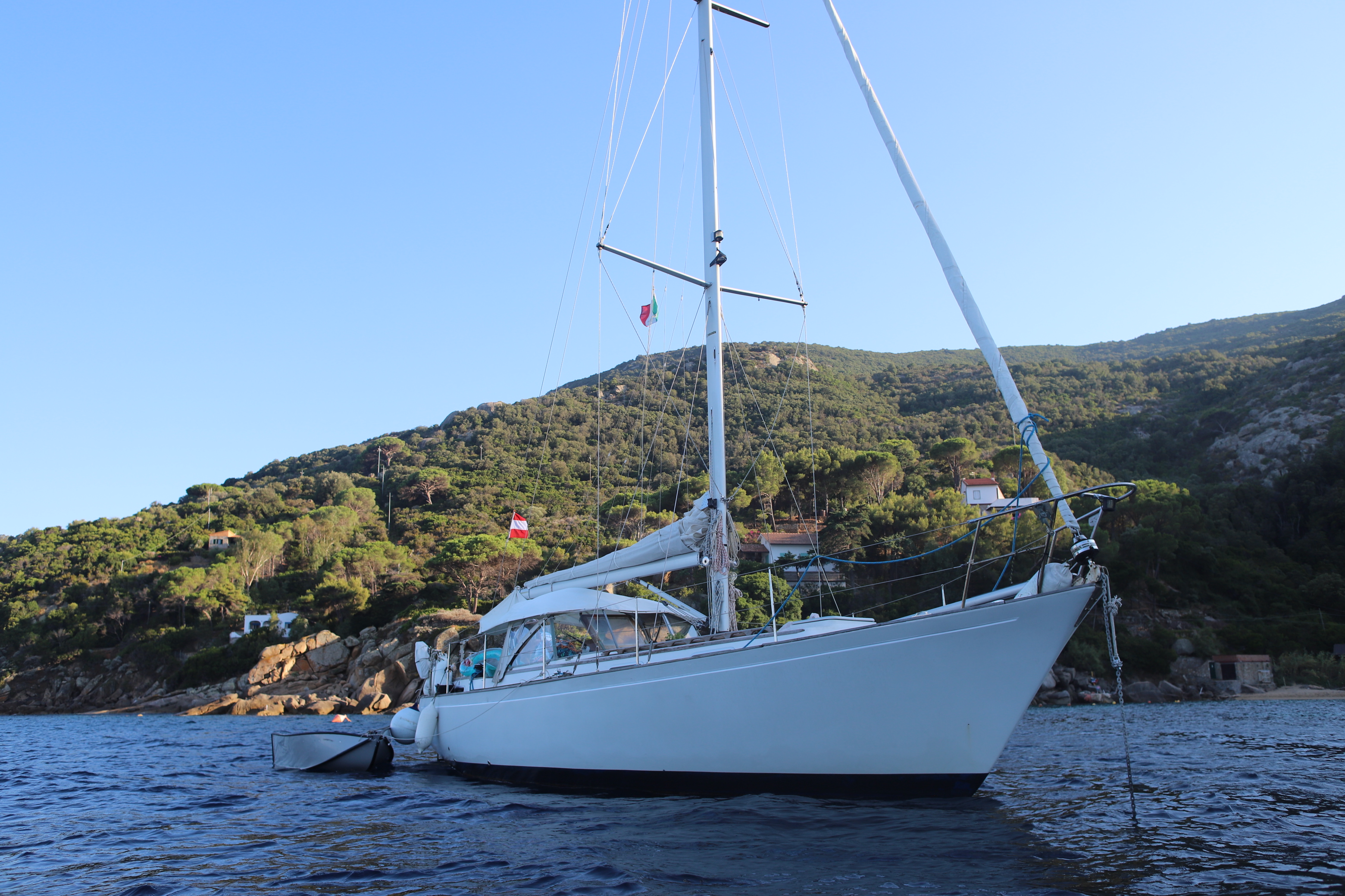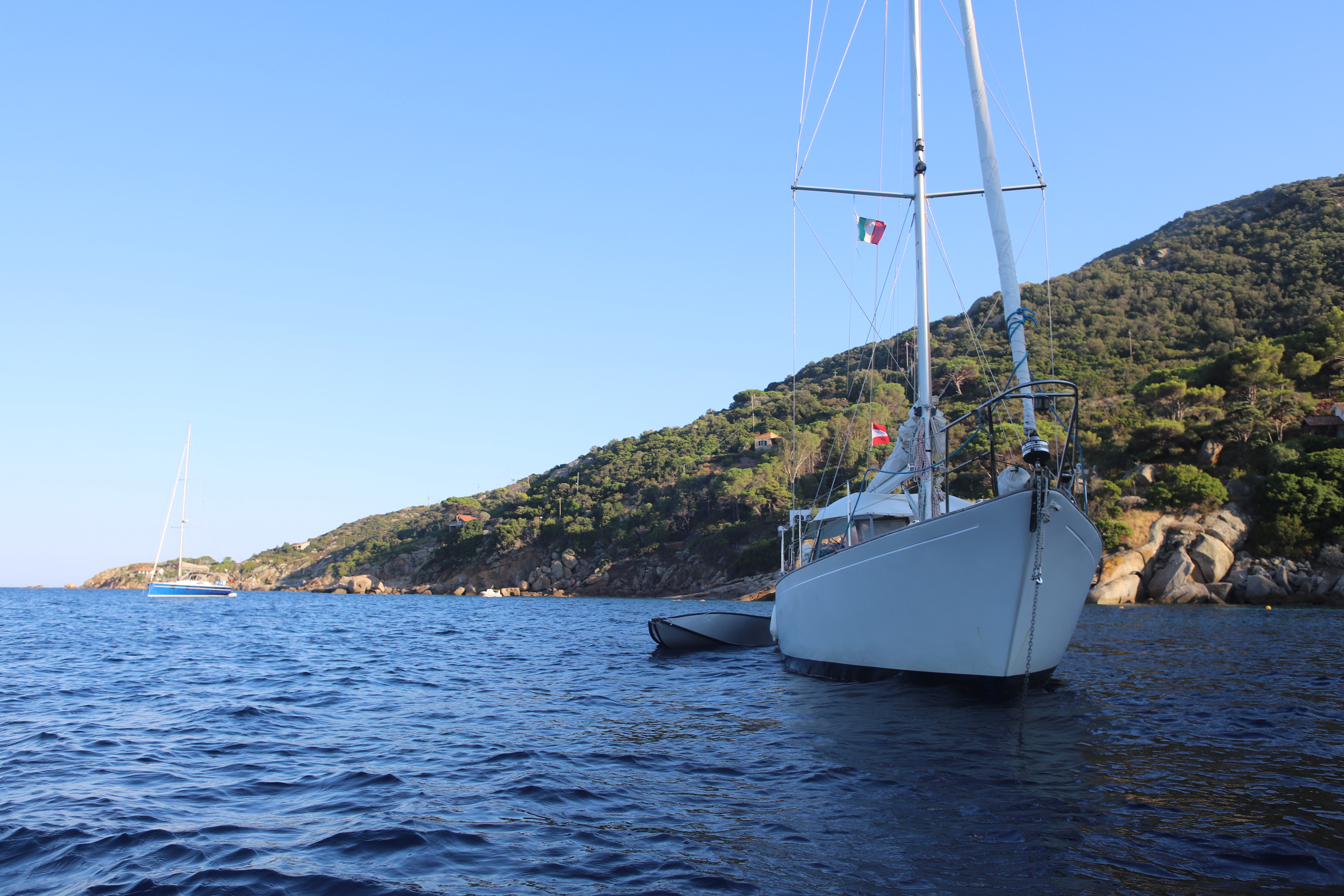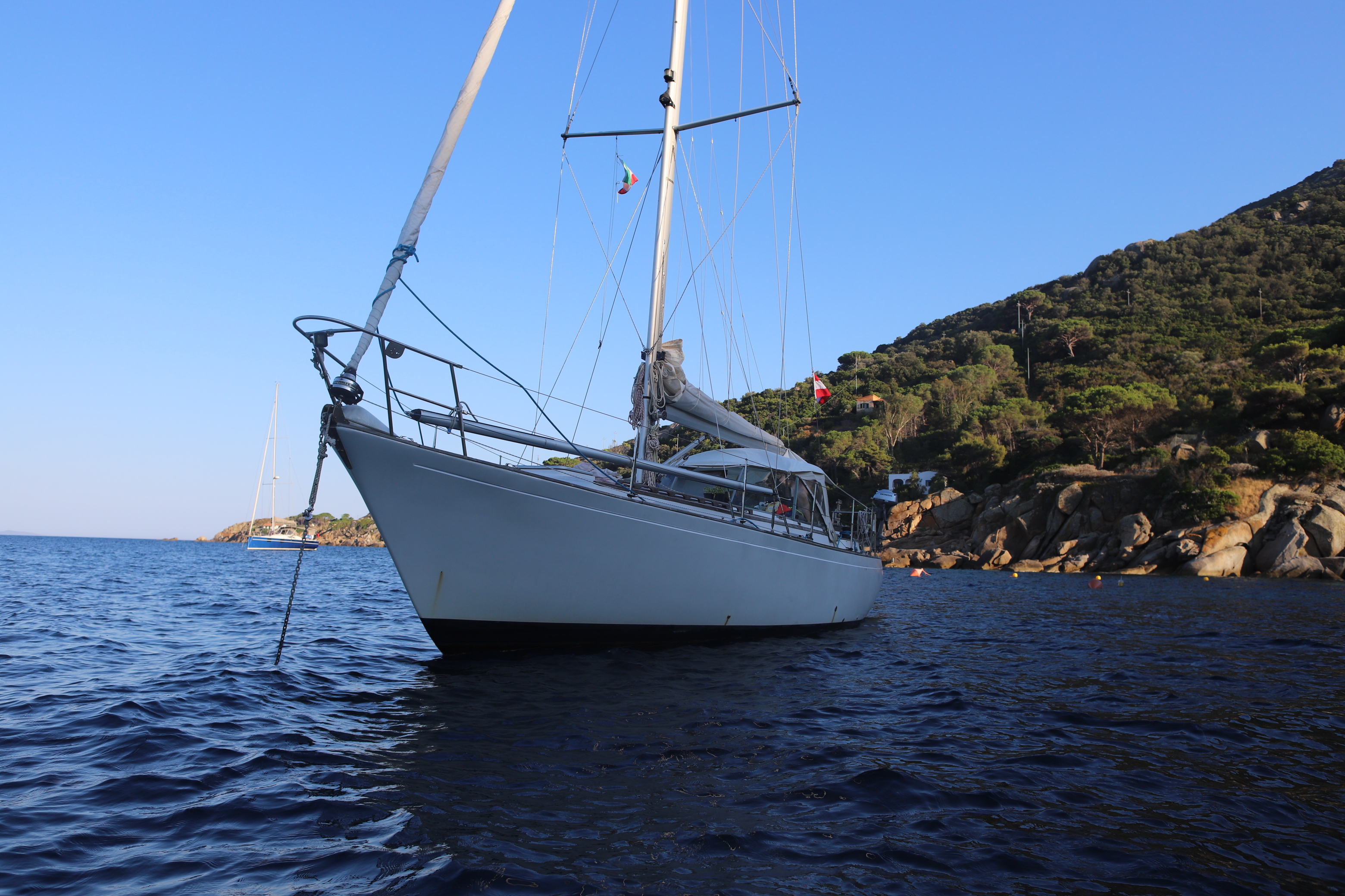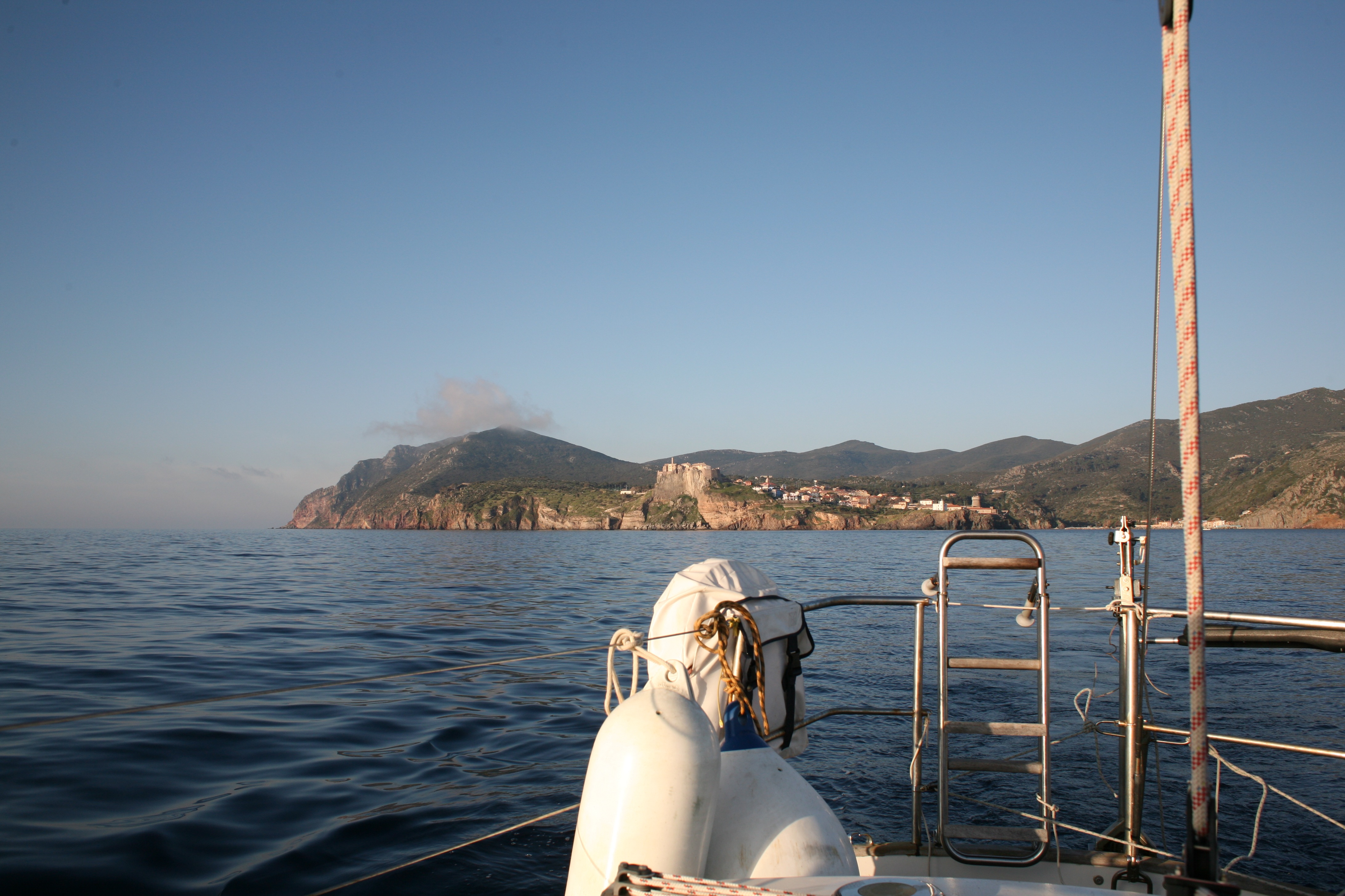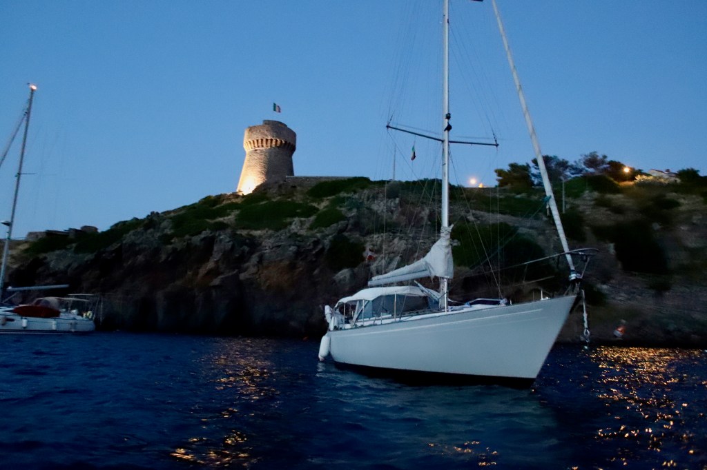 Nach geglücktem Besuch des Berggipfels auf ca. 400 Meter Seehöhe, einer verrosteten Kirche und so manch anderen Bauwerken mit niederer Festigkeit – außer einer drei Meter dicken Steinmauer, die vorm Nichts abzuwehren schien, kamen wir glücklich und zufrieden auf ILVA zurück. Beiboot abbauen, kochen, Kram verstauen, den Autopilot vorbereiten. Schon bald setzte ablandiger Wind ein – vor Anker ein Geschenk Gottes, dann noch ein Achterl rot, dann ab in die Koje, der Wind kam immer mehr in die Gänge, böig, schon fast 5 bft, dann 6, die Kette riss, neben uns eine Boje mit Blinklicht, die touchierten wir mittlwerweile, weil unser Schwojradius größer und größer wurde. So auch der Wind, schon sicher 7 bft. Wir wussten nicht, ob der Anker gerutscht war, dazu das Wissen und diese komische Dinger unter Wasser mit der losen Vorahnung, dass ich da am nächsten Morgen wohl oder übel tauchen musste – bei 15 Grad Wassertemperatur – und natürlich: Legerwall – hinter uns die Felsen! Ankerversatz einschalten, in die Koje und versuchen, dran zu denken, dass unser Anker noch nie nachgelassen hatte. Schließlich brach der Morgen an und alles war beim Alten. Schon vor dem Frühstück verließen wir die Bucht mit Autopilot, Kurs 60, Cecina im Fokus. Das Wetter war diesig, so hatten wir das Mittelmeer noch nie gesehen. Capraia verschwand schon nach 30 Minuten hinter uns in feuchten Wolken.