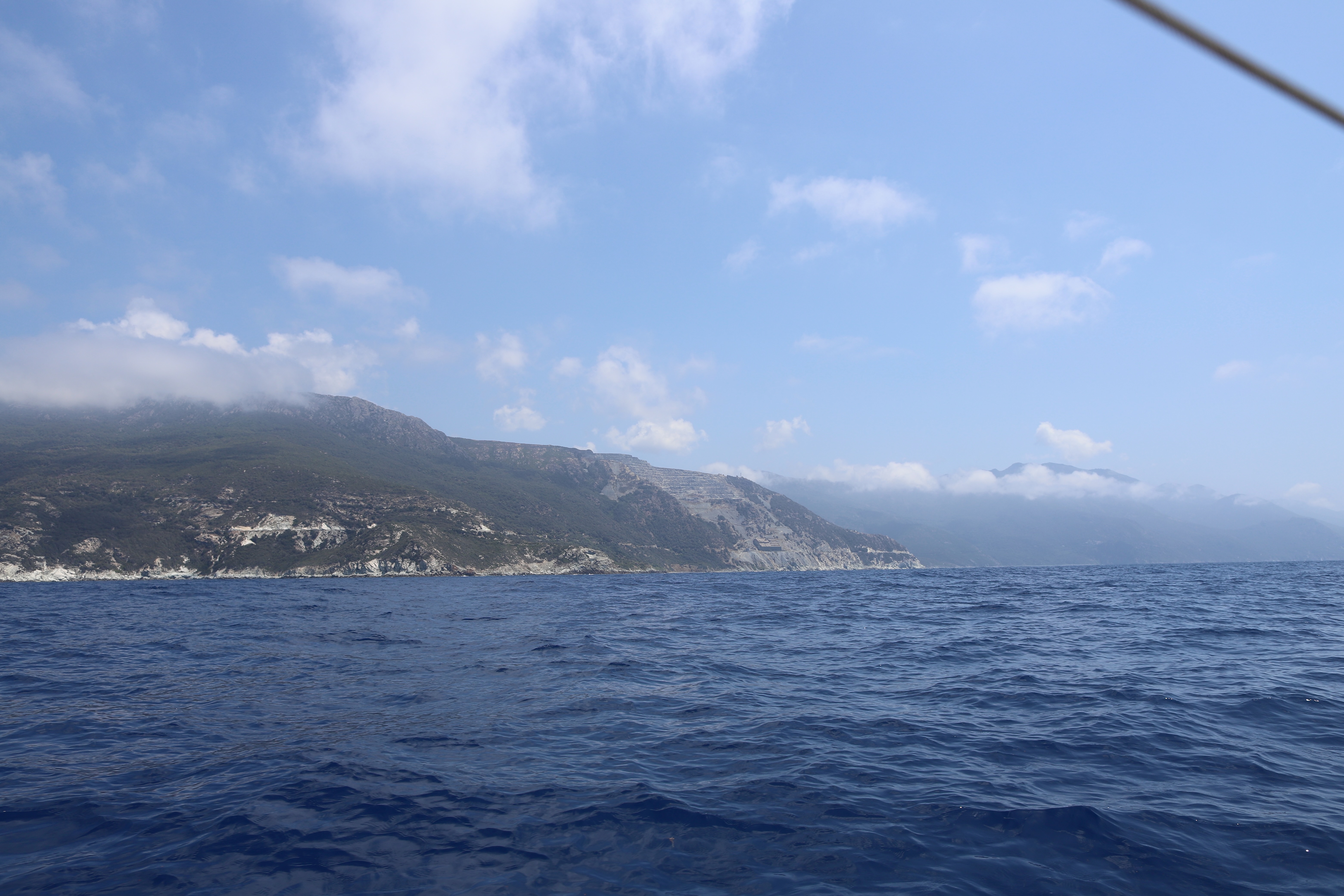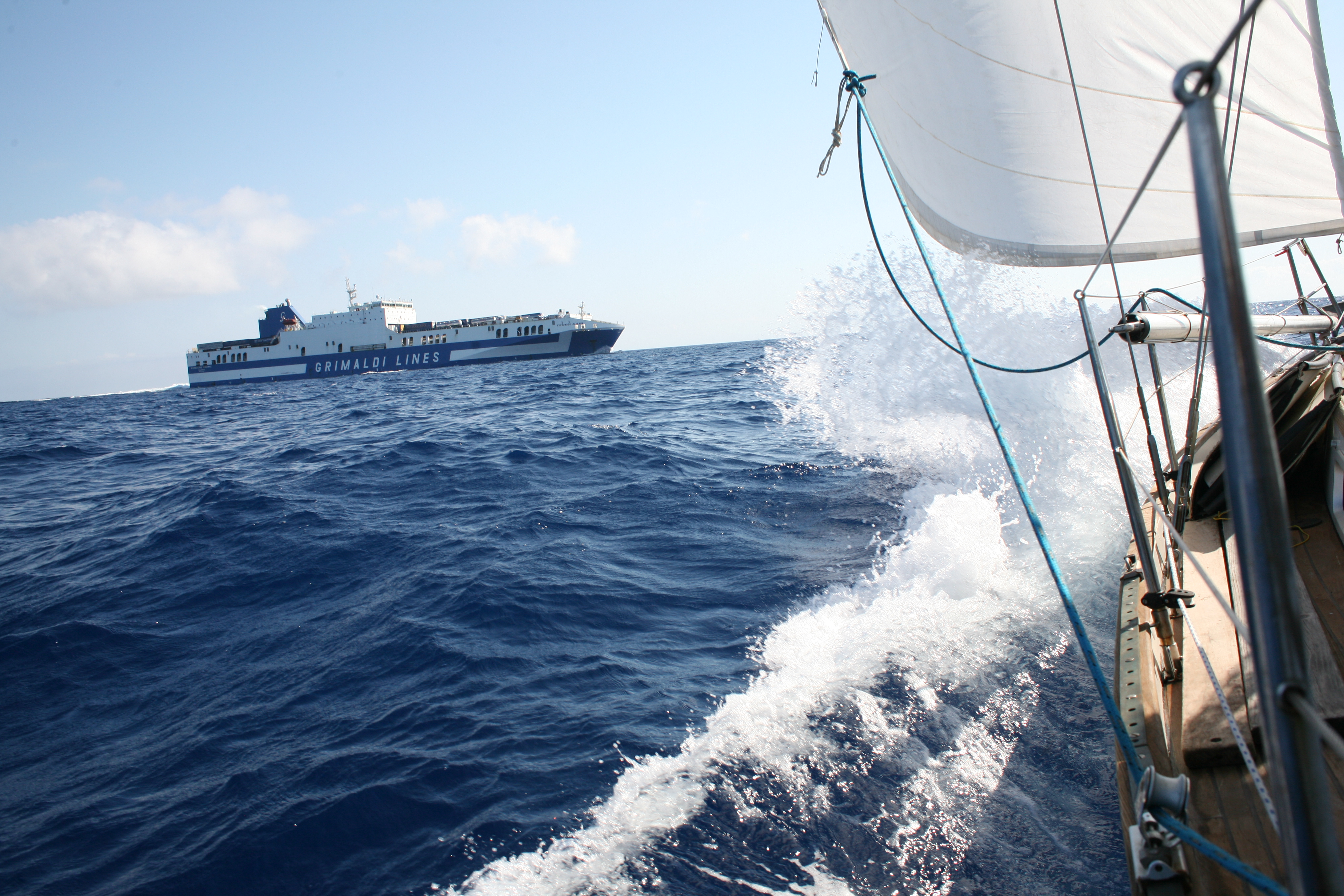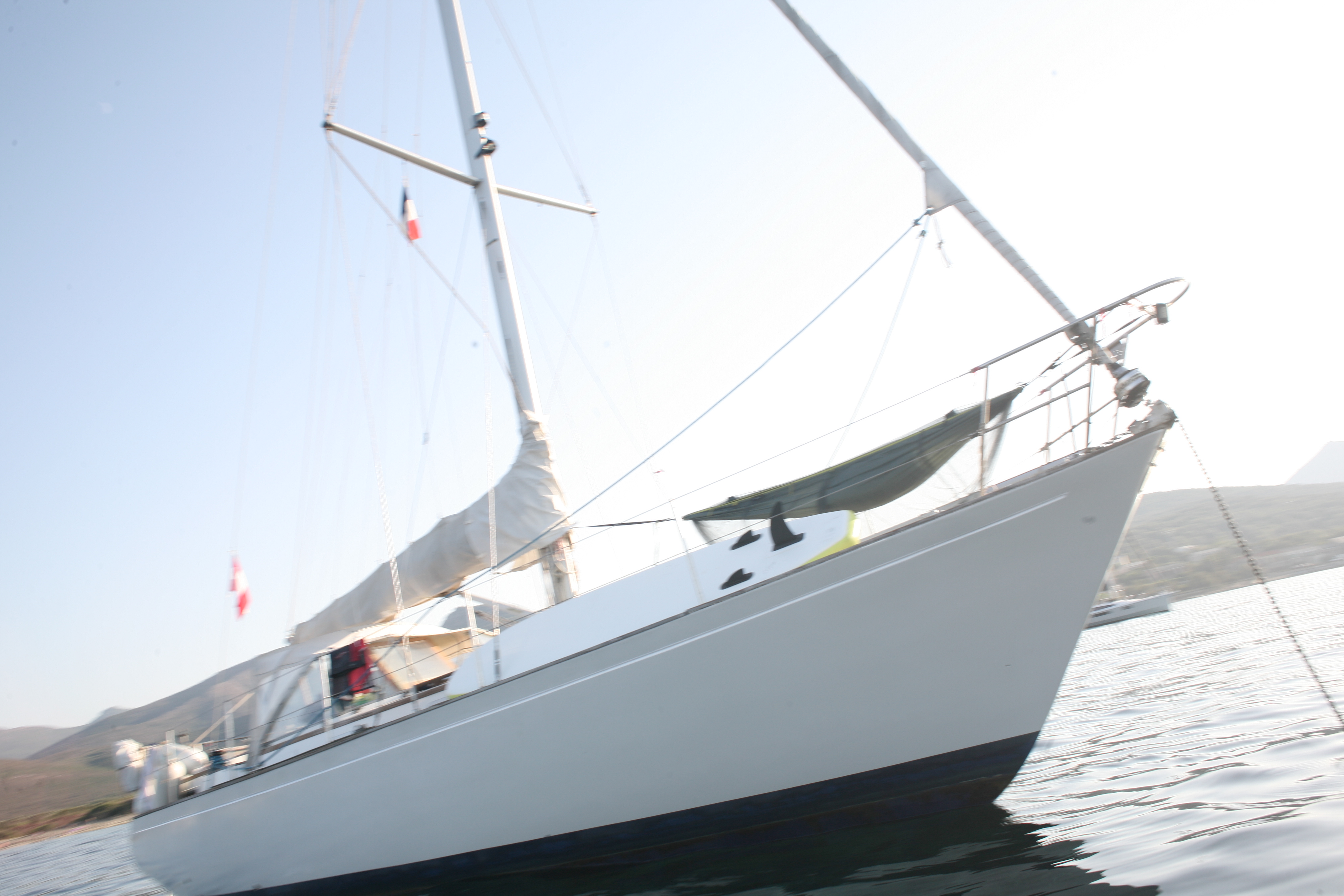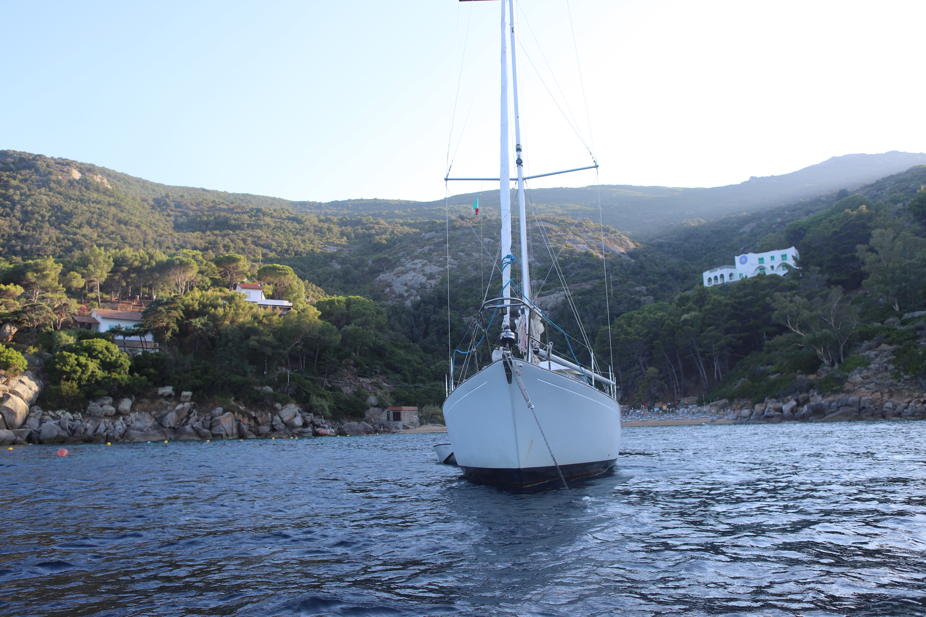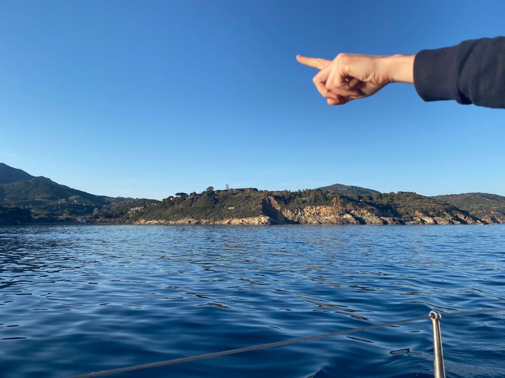 Nach geglücktem Besuch des Berggipfels auf ca. 400 Meter Seehöhe, einer verrosteten Kirche und so manch anderen Bauwerken mit niederer Festigkeit – außer einer drei Meter dicken Steinmauer, die vorm Nichts abzuwehren schien, kamen wir glücklich und zufrieden auf ILVA zurück. Beiboot abbauen, kochen, Kram verstauen, den Autopilot vorbereiten. Schon bald setzte ablandiger Wind ein – vor Anker ein Geschenk Gottes, dann noch ein Achterl rot, dann ab in die Koje, der Wind kam immer mehr in die Gänge, böig, schon fast 5 bft, dann 6, die Kette riss, neben uns eine Boje mit Blinklicht, die touchierten wir mittlwerweile, weil unser Schwojradius größer und größer wurde. So auch der Wind, schon sicher 7 bft. Wir wussten nicht, ob der Anker gerutscht war, dazu das Wissen und diese komische Dinger unter Wasser mit der losen Vorahnung, dass ich da am nächsten Morgen wohl oder übel tauchen musste – bei 15 Grad Wassertemperatur – und natürlich: Legerwall – hinter uns die Felsen! Ankerversatz einschalten, in die Koje und versuchen, dran zu denken, dass unser Anker noch nie nachgelassen hatte. Schließlich brach der Morgen an und alles war beim Alten. Schon vor dem Frühstück verließen wir die Bucht mit Autopilot, Kurs 60, Cecina im Fokus. Das Wetter war diesig, so hatten wir das Mittelmeer noch nie gesehen. Capraia verschwand schon nach 30 Minuten hinter uns in feuchten Wolken.