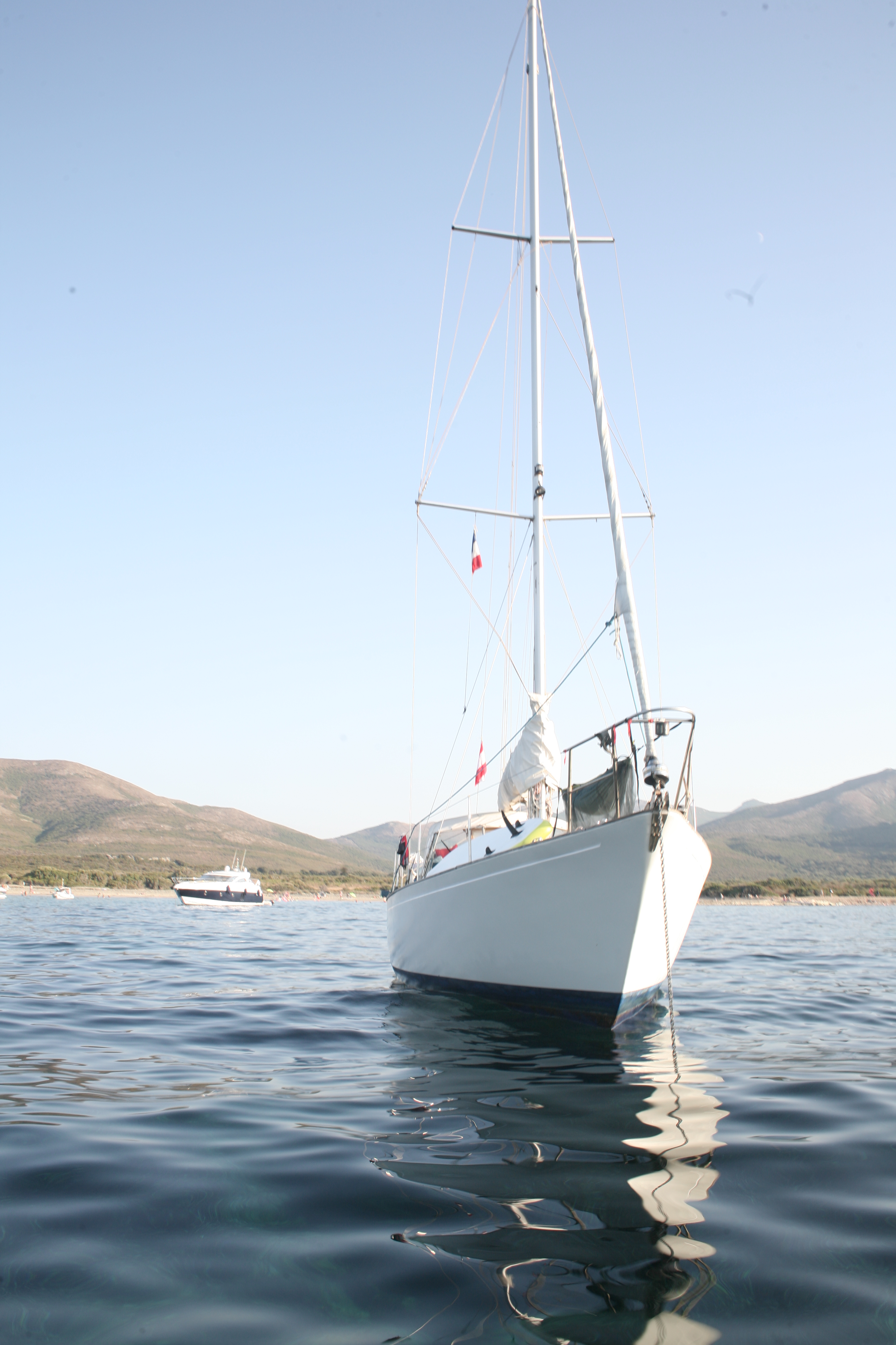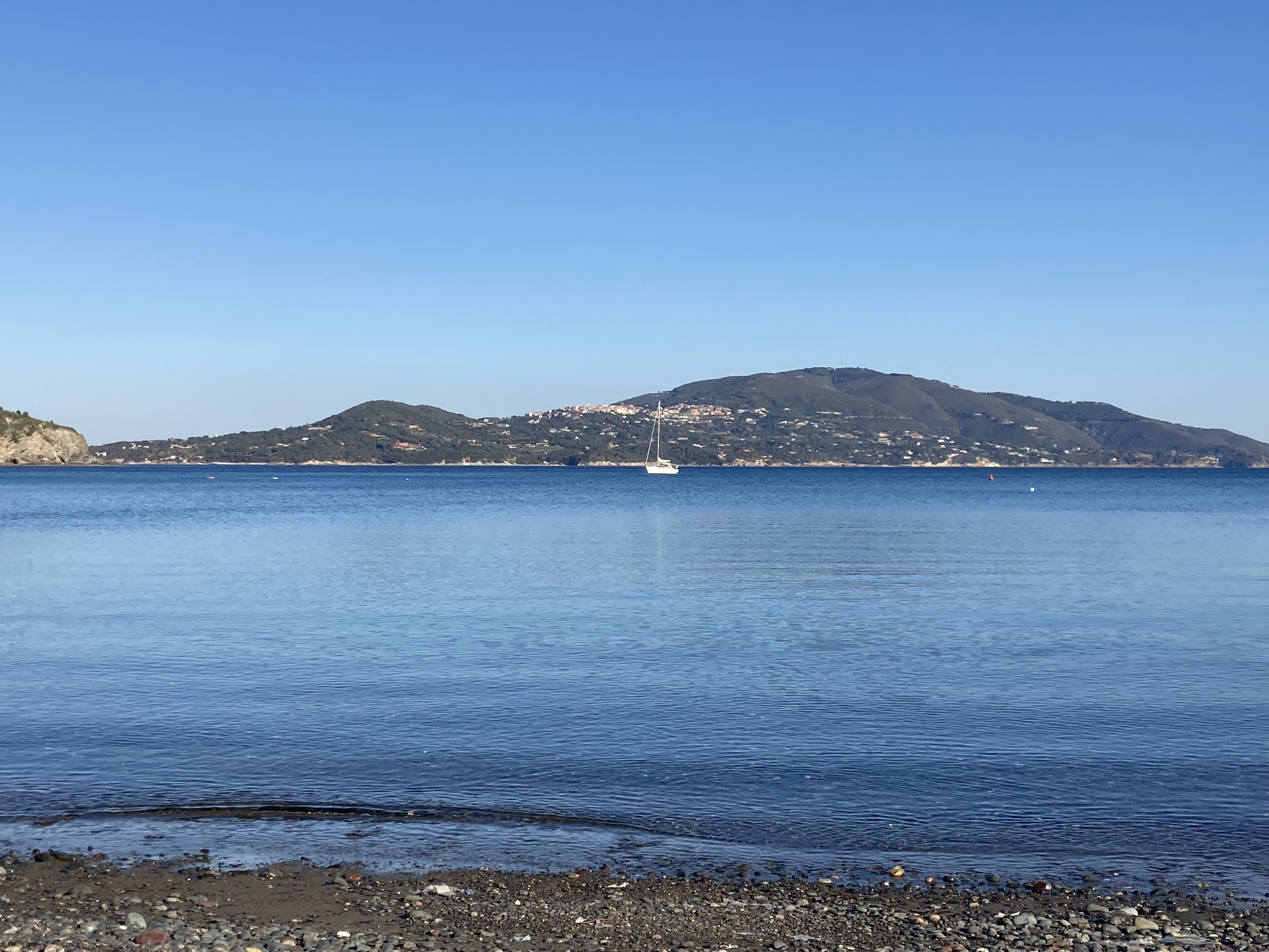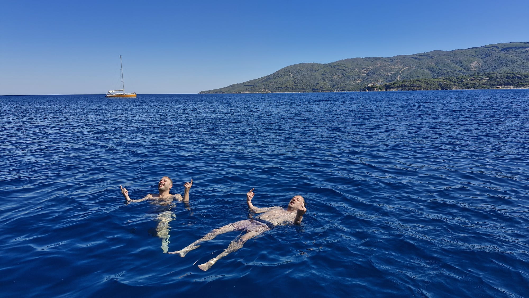Dann gehen wir vor Anker im Bojenfeld, ankern verboten zwar – aber, das kann nur im Sommer gelten – wenn 50 Yachten die Bucht belegen und sicher auch beschallen. Die Bojen waren nicht mal gesetzt. Nur die Betonfundamente sah man im klaren Wasser bis auf zwölf Meter. Fünf Minuten später sitzen wir im Salon, schauen hinaus auf die Berghänge, die allesamt nach Sonne, Wein, Salz und Staub aussehen, dann essen wir die fette Rohwurst der Italiener und einen zu einer Rollade gepressten Speck, geil !! Im Urlaub kann man sich ja alles erlauben, oder? Vor allem, wenn einem die Fleischeslust in die Birne steigt…. Dazu ein gefügiger Espresso und das Schreien der Möwen. Ist das Urlaubsflair? Kanns was anderes sein? Das Leben, ja es ist zurück!! Ja, es ist,…. Yes, we can!!