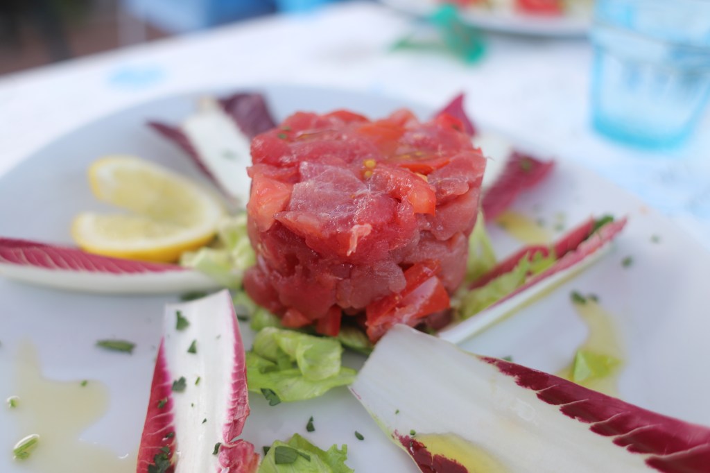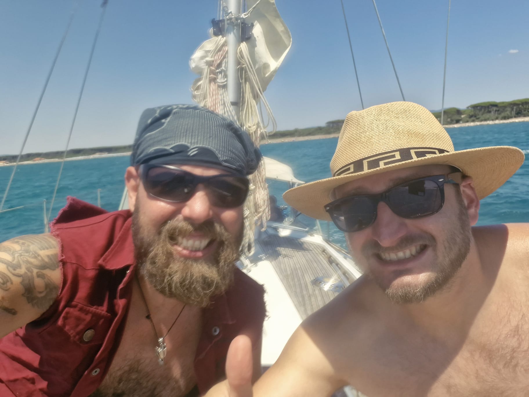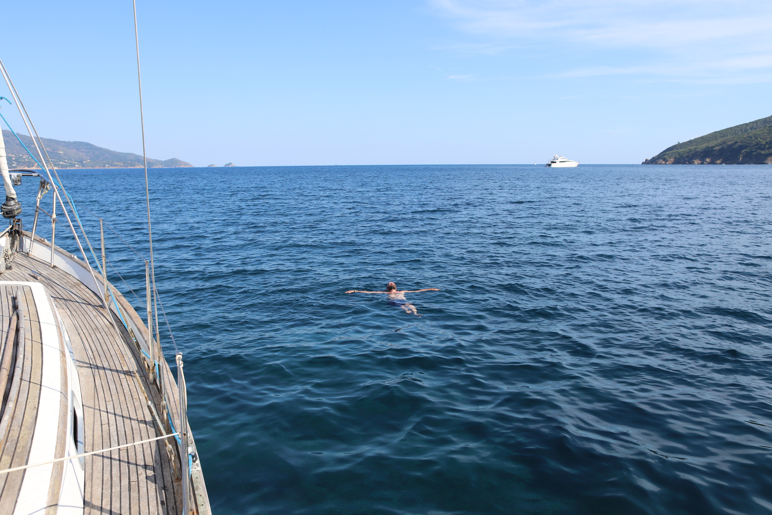 Dann gehen wir vor Anker im Bojenfeld, ankern verboten zwar – aber, das kann nur im Sommer gelten – wenn 50 Yachten die Bucht belegen und sicher auch beschallen. Die Bojen waren nicht mal gesetzt. Nur die Betonfundamente sah man im klaren Wasser bis auf zwölf Meter. Fünf Minuten später sitzen wir im Salon, schauen hinaus auf die Berghänge, die allesamt nach Sonne, Wein, Salz und Staub aussehen, dann essen wir die fette Rohwurst der Italiener und einen zu einer Rollade gepressten Speck, geil !! Im Urlaub kann man sich ja alles erlauben, oder? Vor allem, wenn einem die Fleischeslust in die Birne steigt…. Dazu ein gefügiger Espresso und das Schreien der Möwen. Ist das Urlaubsflair? Kanns was anderes sein? Das Leben, ja es ist zurück!! Ja, es ist,…. Yes, we can!!