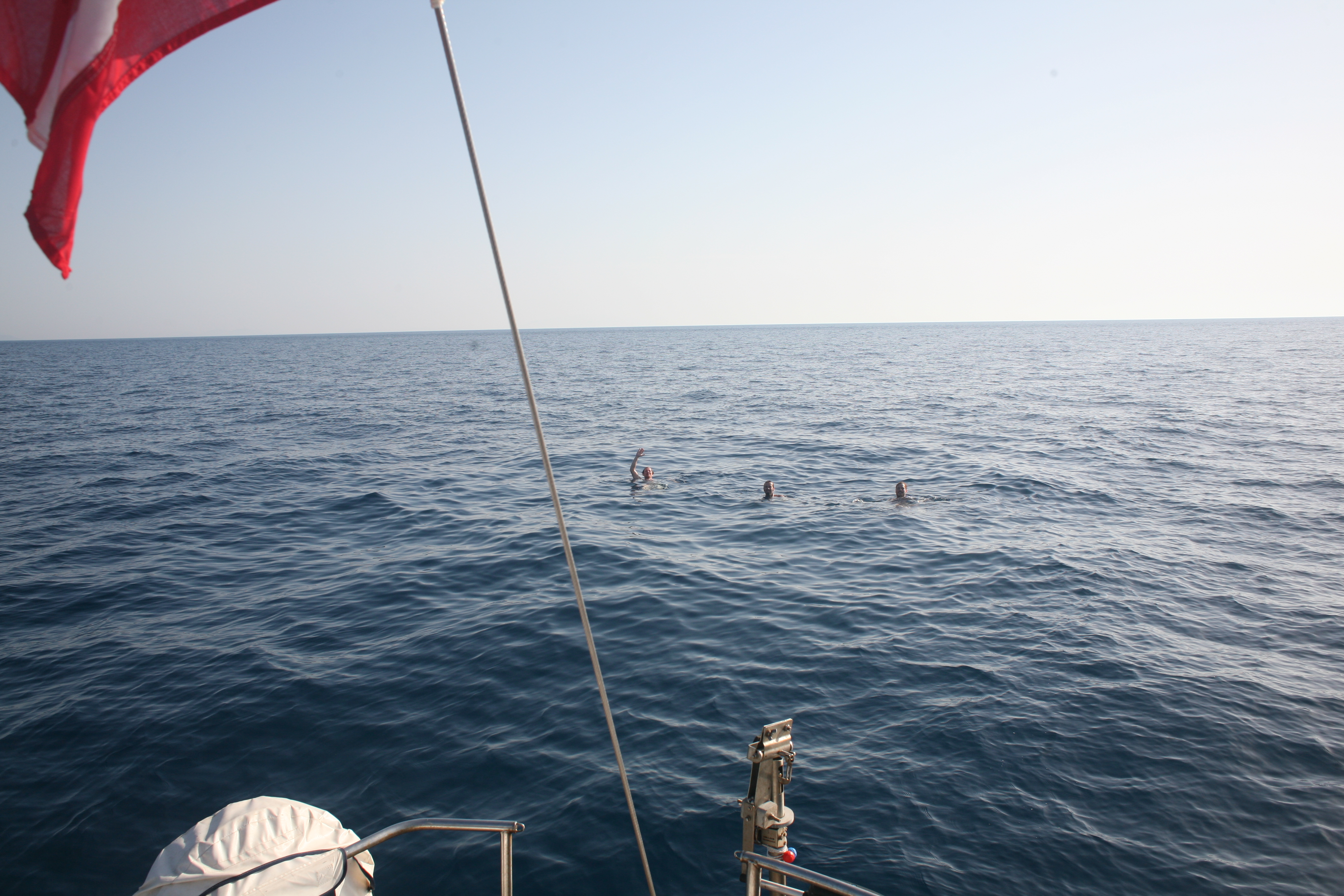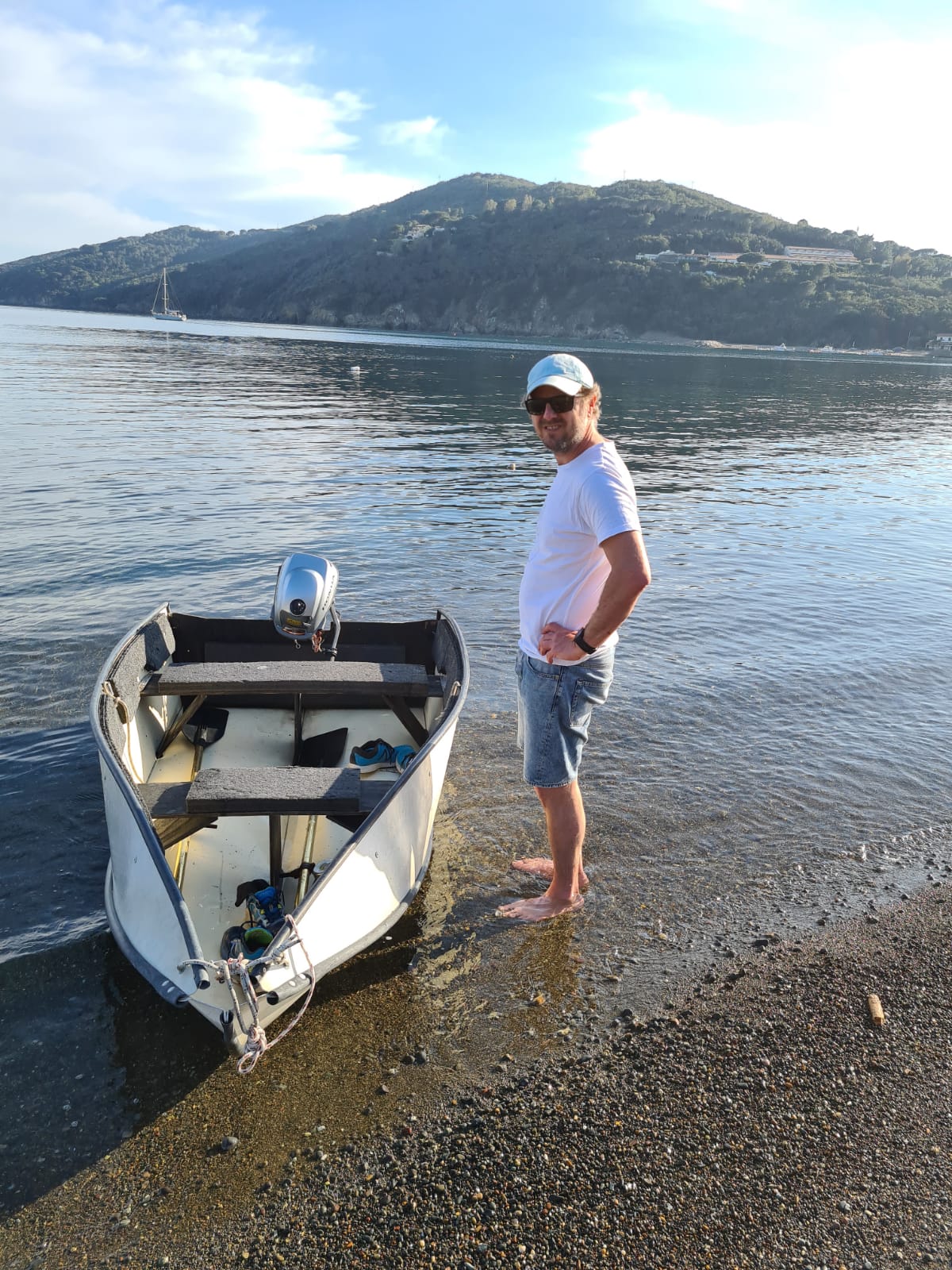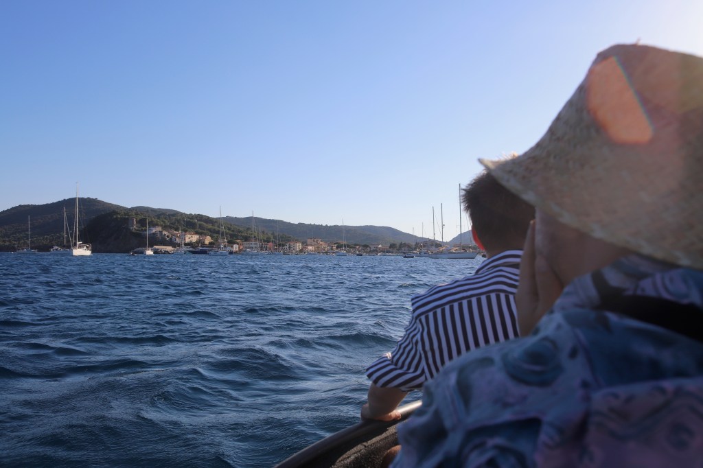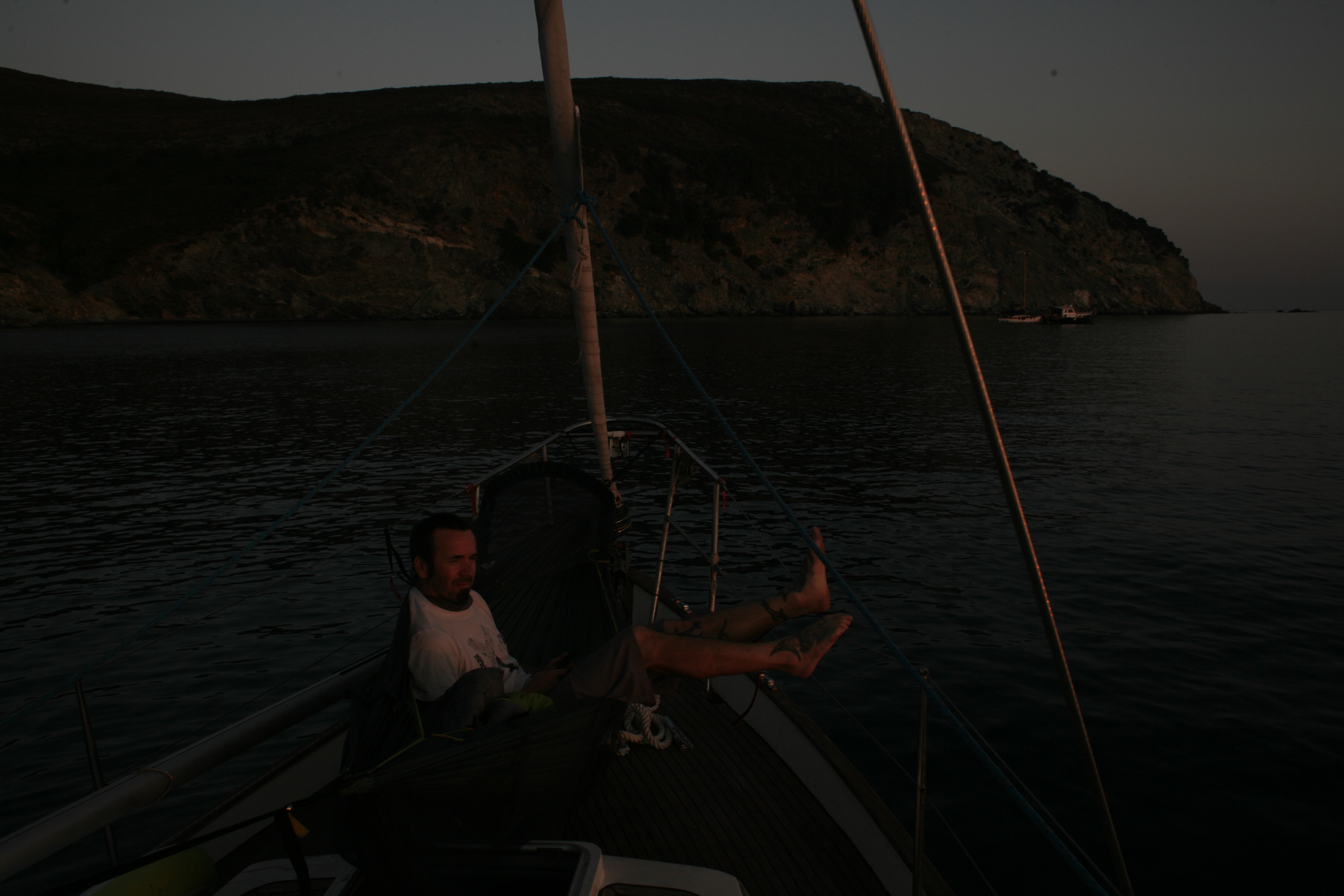 Unser Beiboot zieht erstaunlich viel Wasser. Unklar bleibt, wo es denn eigentlich reinkommt. Mamabert und ich fuhren mit leichter Motorkraft eine Runde in der Bucht, ehe wir in den Hafen liefen, ich am Motor, sie ganz vorne, mit einem Becher in der Hand, schöpfend. Oben auf der Bergstraße (bei schätzungsweise Straßenkilometer 0,4) standen ein paar Wanderer, die lachten, ja, unser fahrendes Regal, aus dem noch Wasser geschöpft wird, sieht sicher zum Zerkugeln aus.
