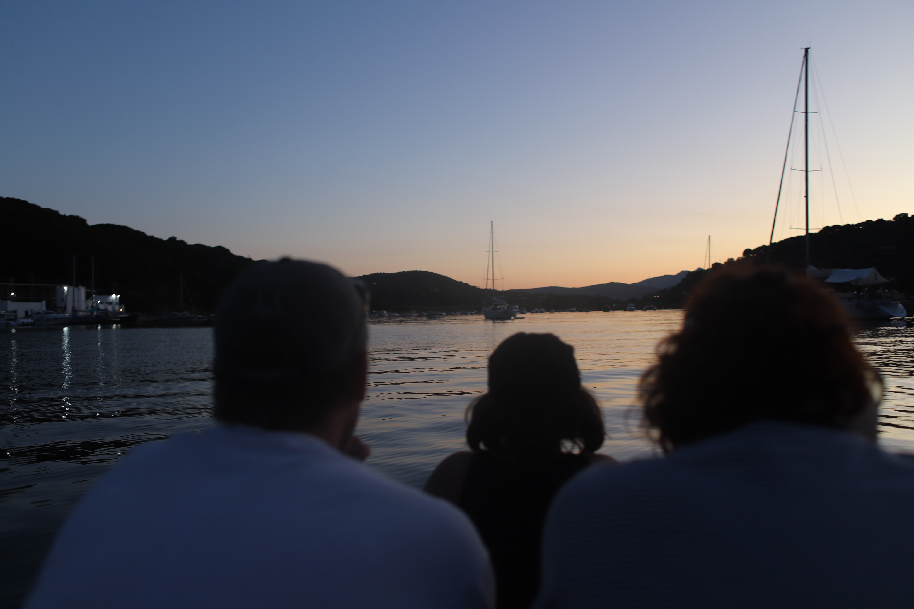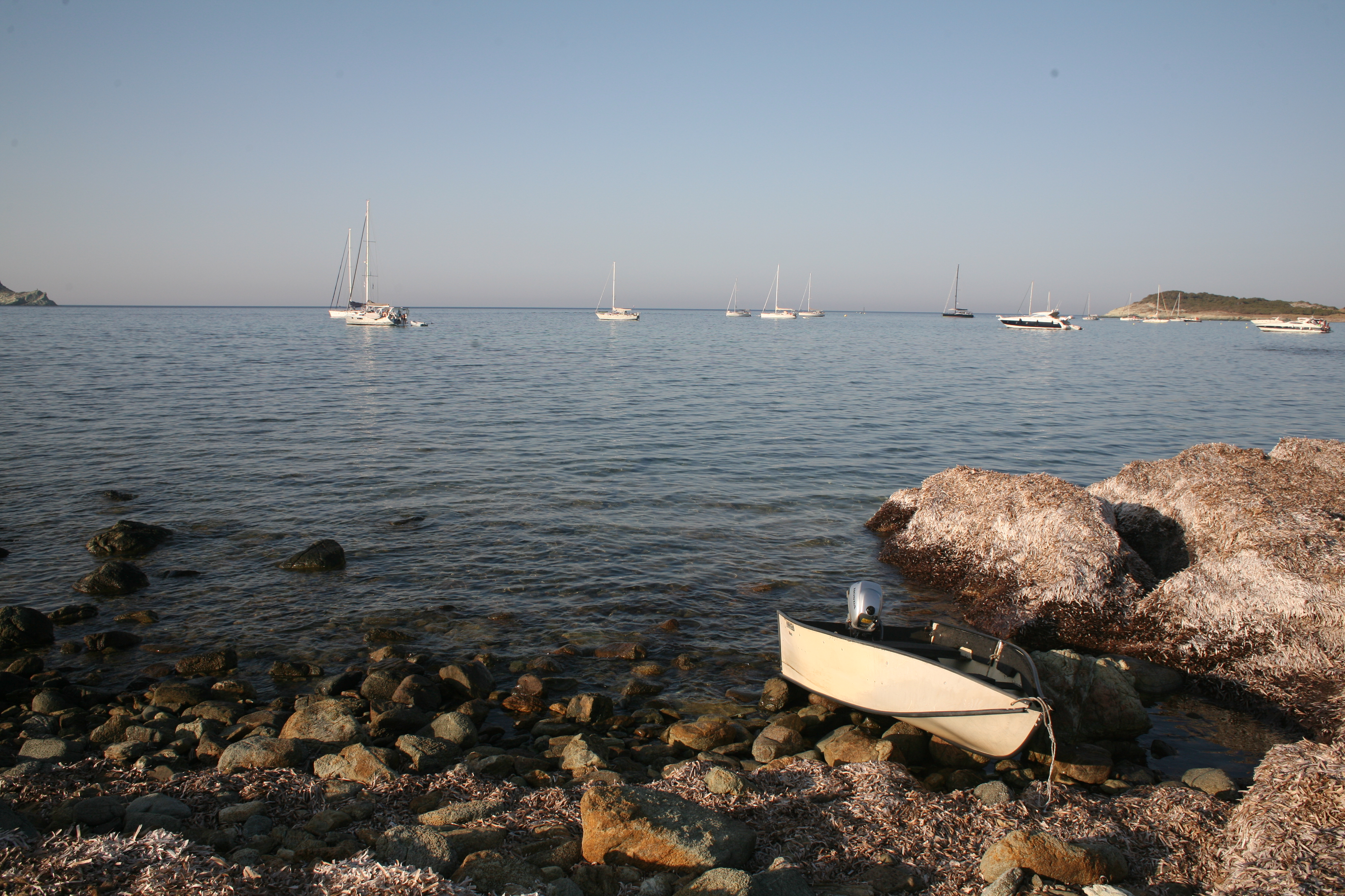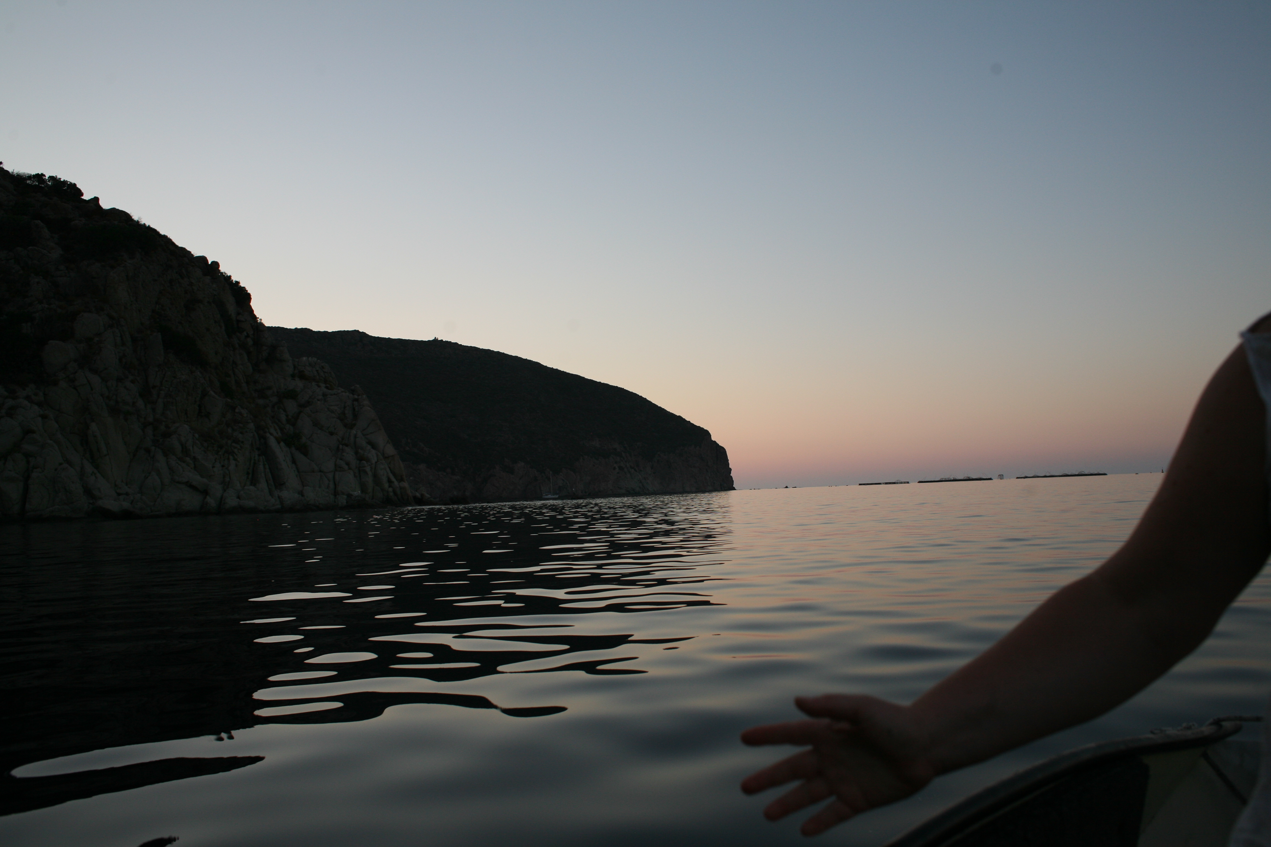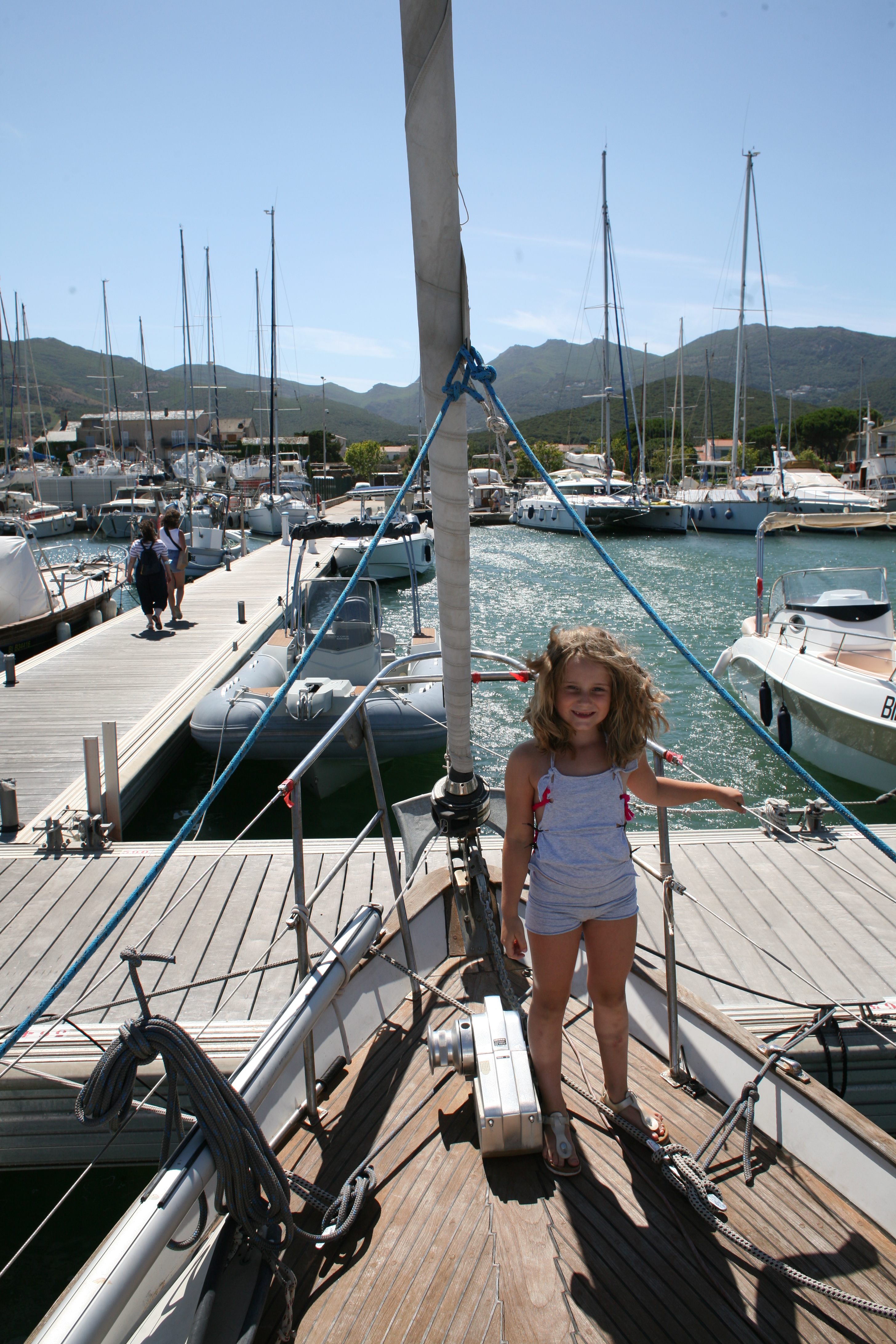 Unser Beiboot zieht erstaunlich viel Wasser. Unklar bleibt, wo es denn eigentlich reinkommt. Mamabert und ich fuhren mit leichter Motorkraft eine Runde in der Bucht, ehe wir in den Hafen liefen, ich am Motor, sie ganz vorne, mit einem Becher in der Hand, schöpfend. Oben auf der Bergstraße (bei schätzungsweise Straßenkilometer 0,4) standen ein paar Wanderer, die lachten, ja, unser fahrendes Regal, aus dem noch Wasser geschöpft wird, sieht sicher zum Zerkugeln aus.