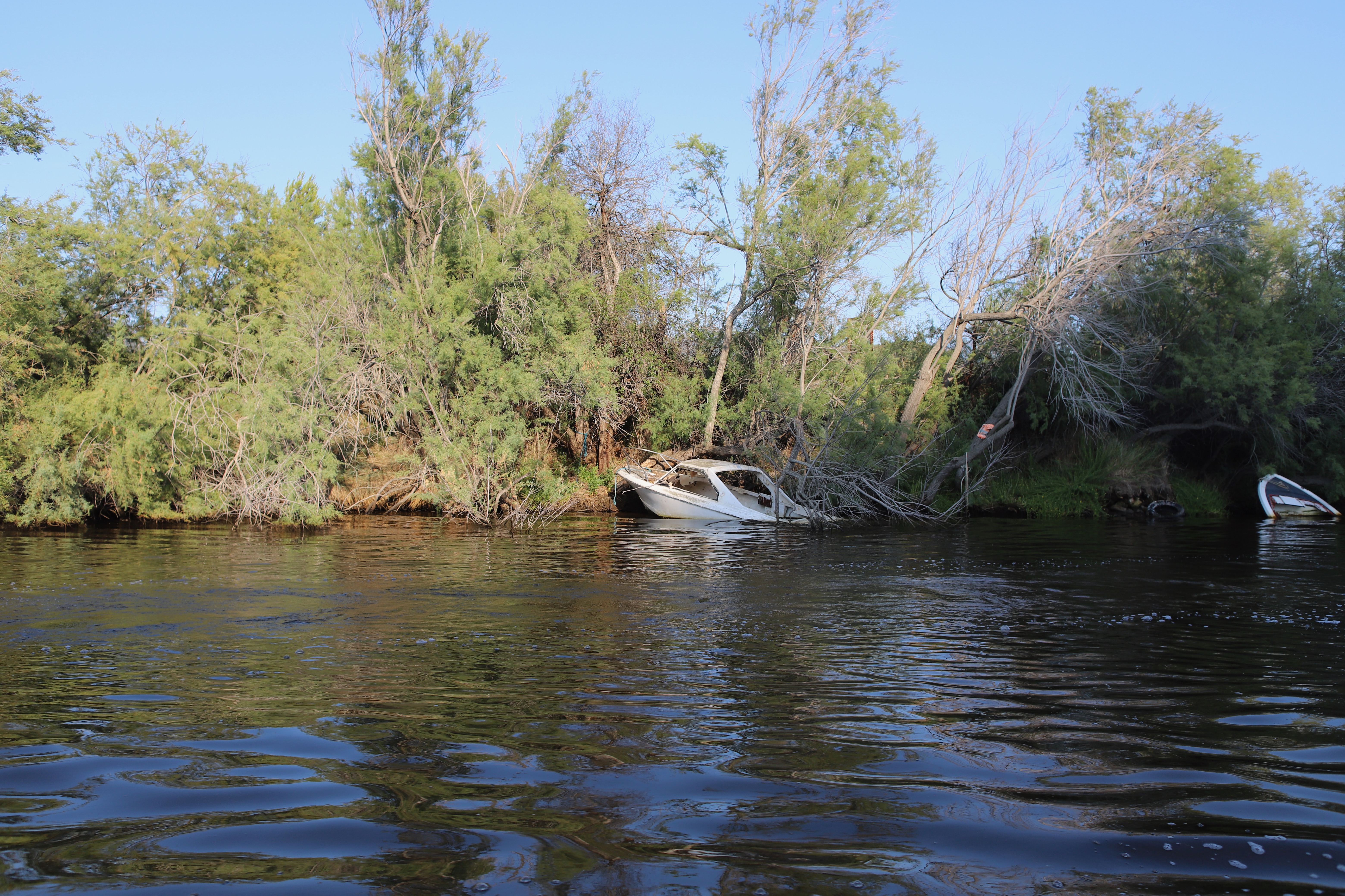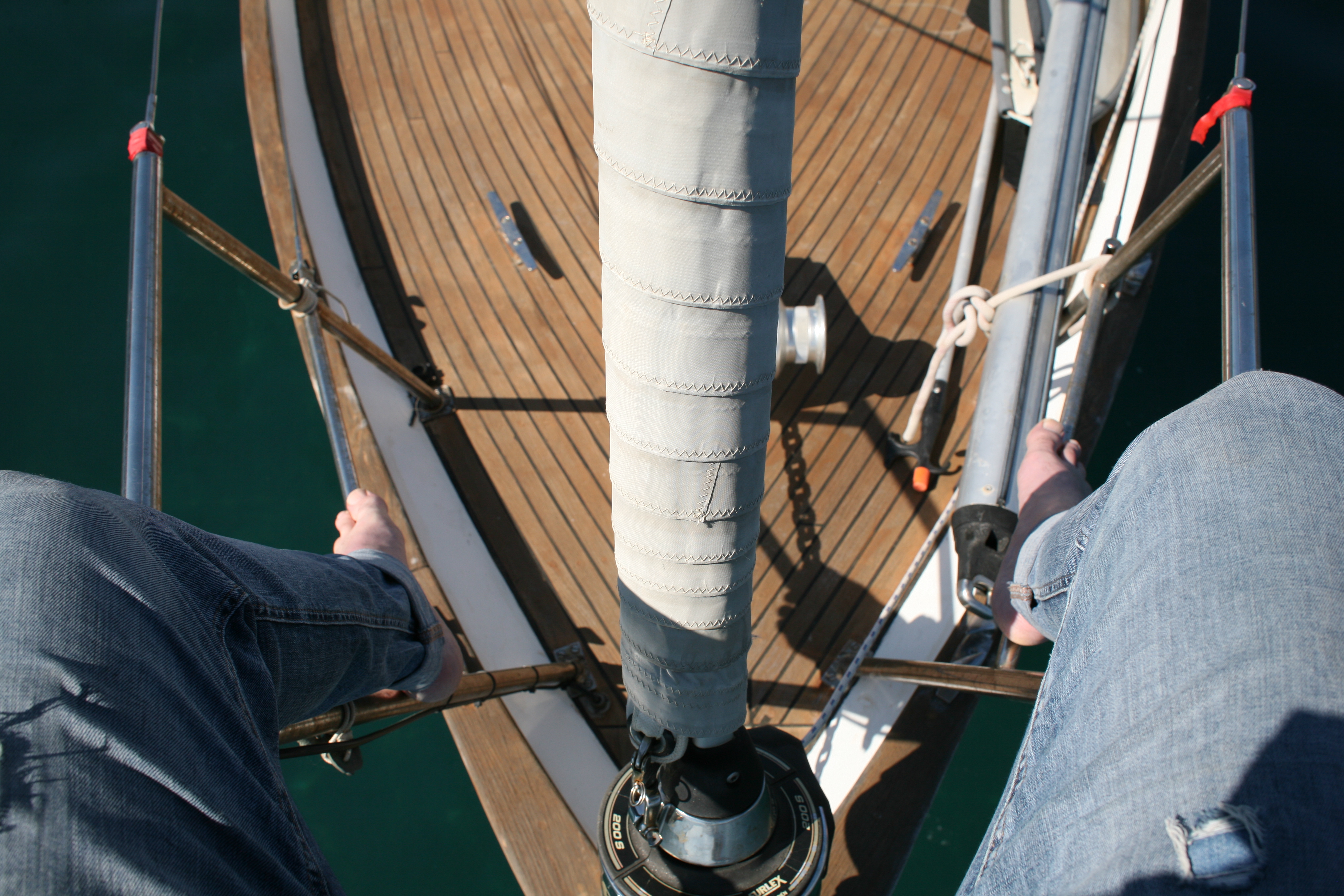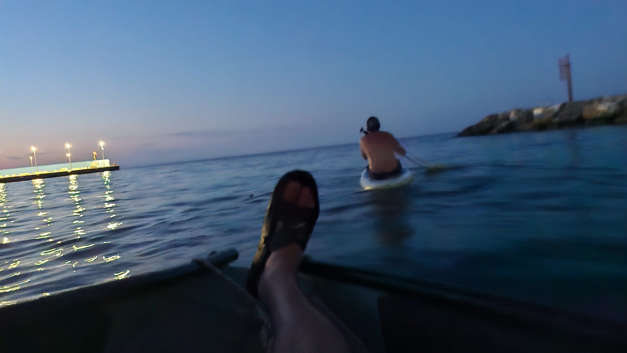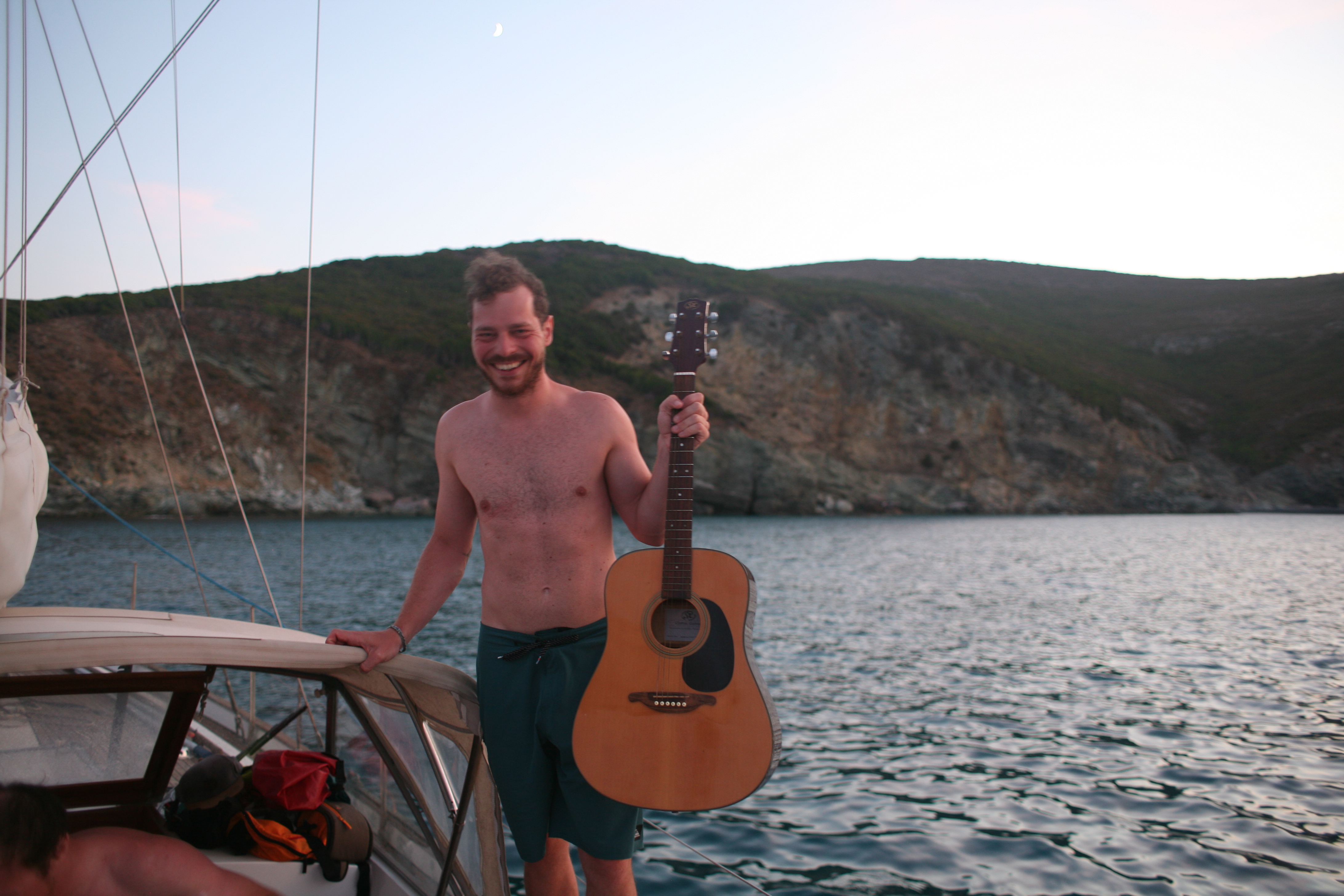 Unser Beiboot zieht erstaunlich viel Wasser. Unklar bleibt, wo es denn eigentlich reinkommt. Mamabert und ich fuhren mit leichter Motorkraft eine Runde in der Bucht, ehe wir in den Hafen liefen, ich am Motor, sie ganz vorne, mit einem Becher in der Hand, schöpfend. Oben auf der Bergstraße (bei schätzungsweise Straßenkilometer 0,4) standen ein paar Wanderer, die lachten, ja, unser fahrendes Regal, aus dem noch Wasser geschöpft wird, sieht sicher zum Zerkugeln aus.