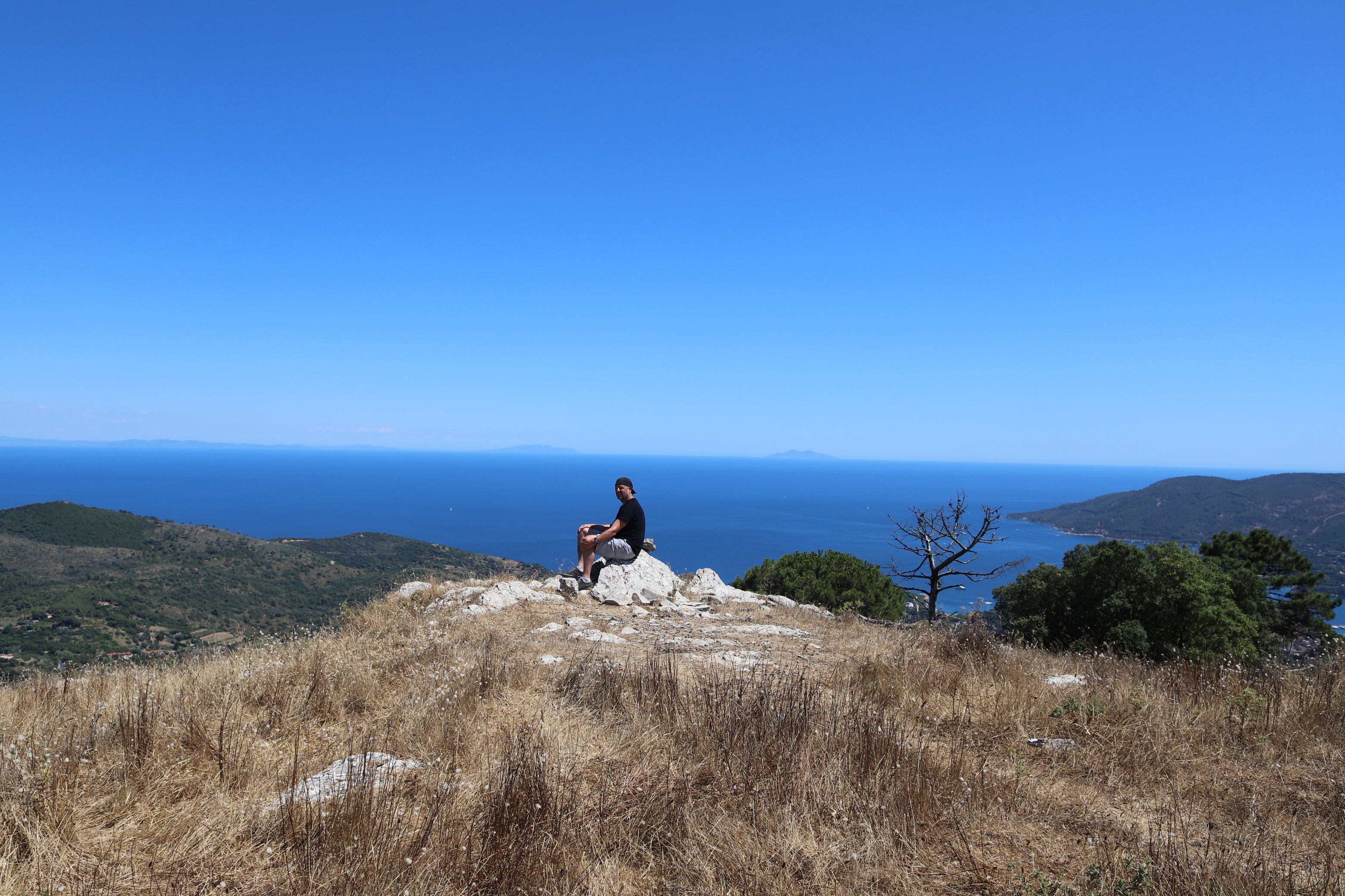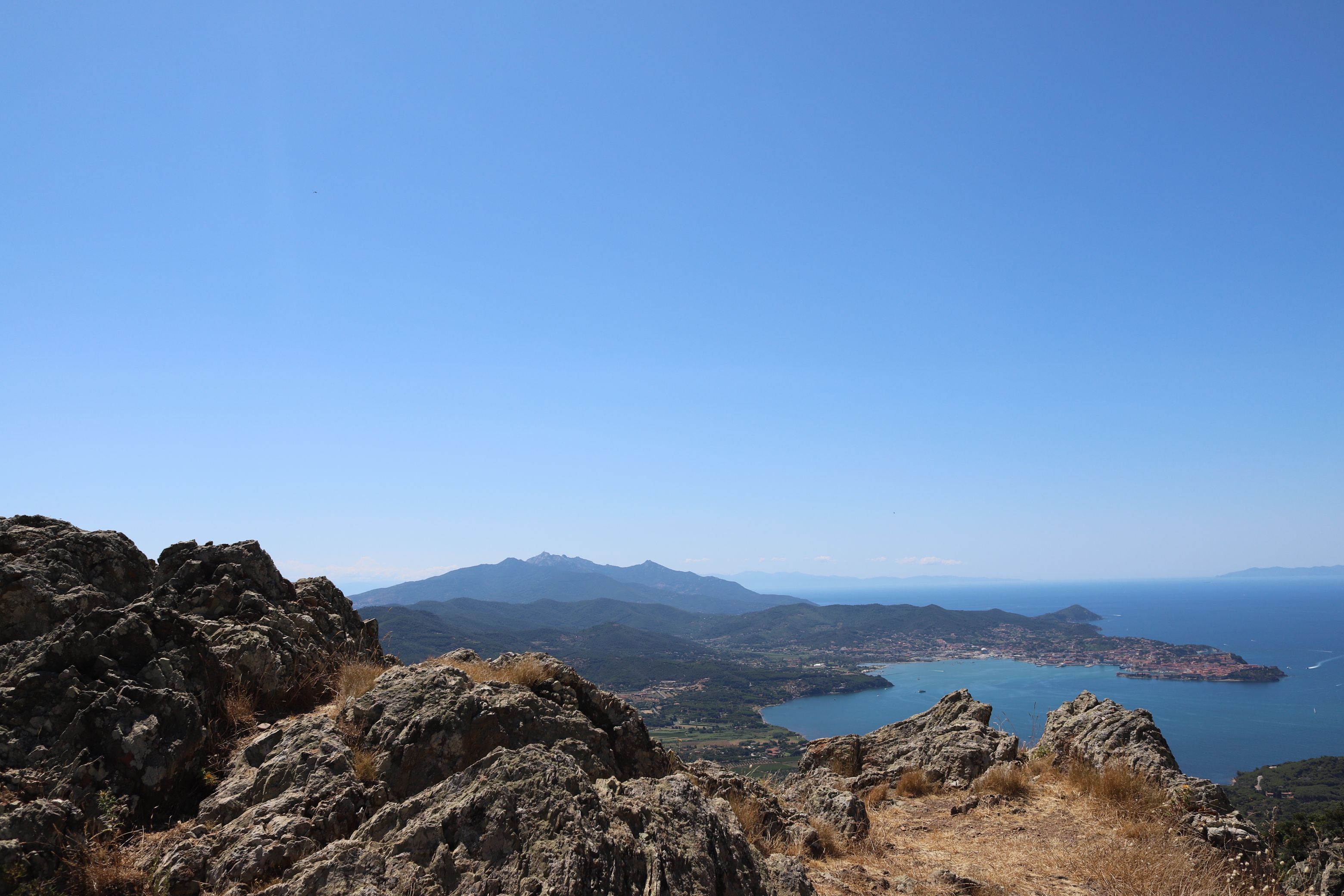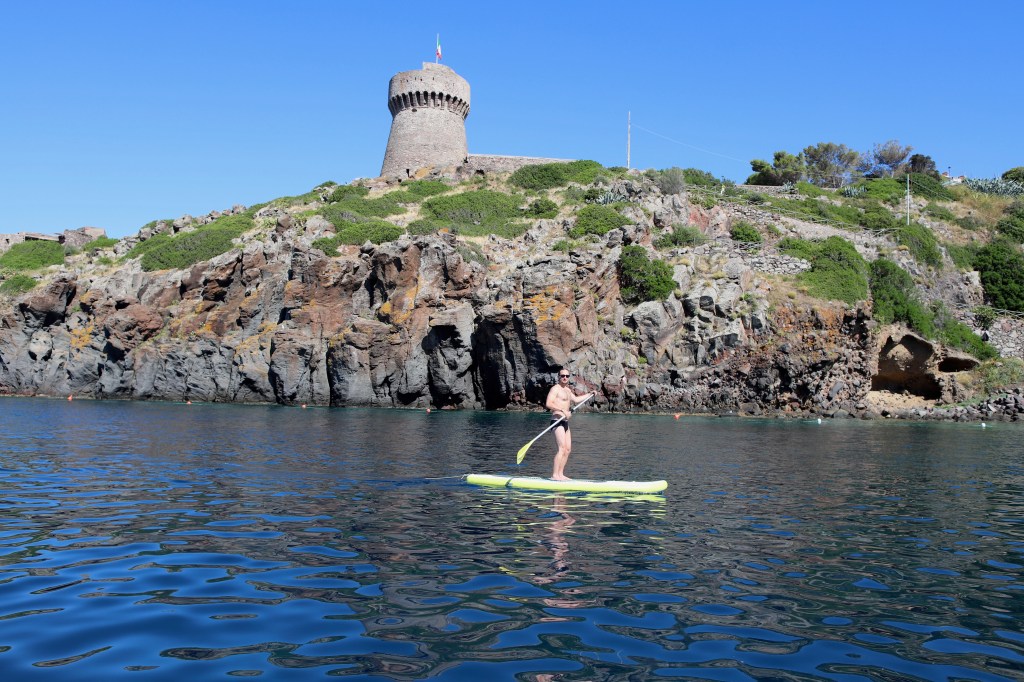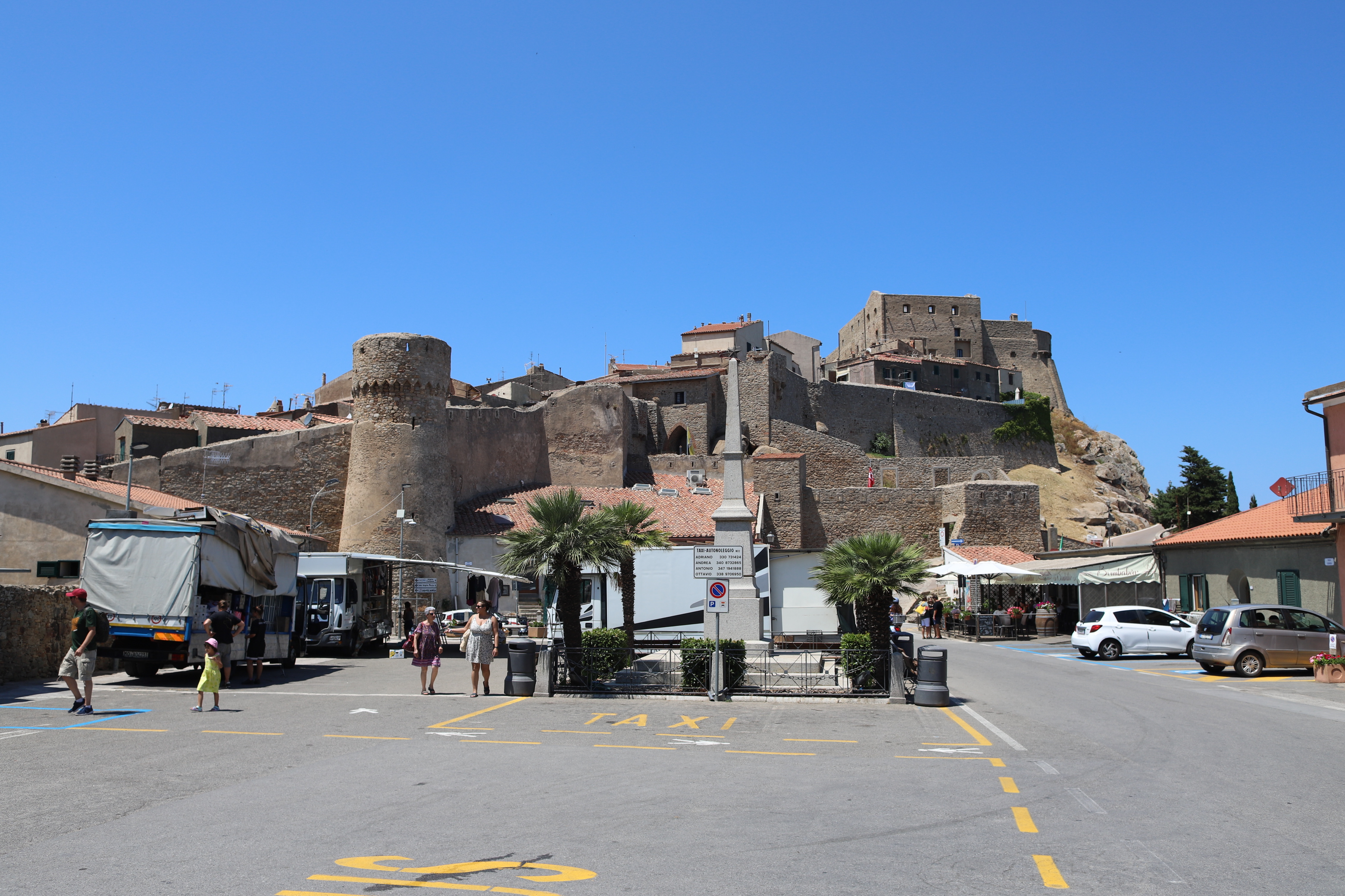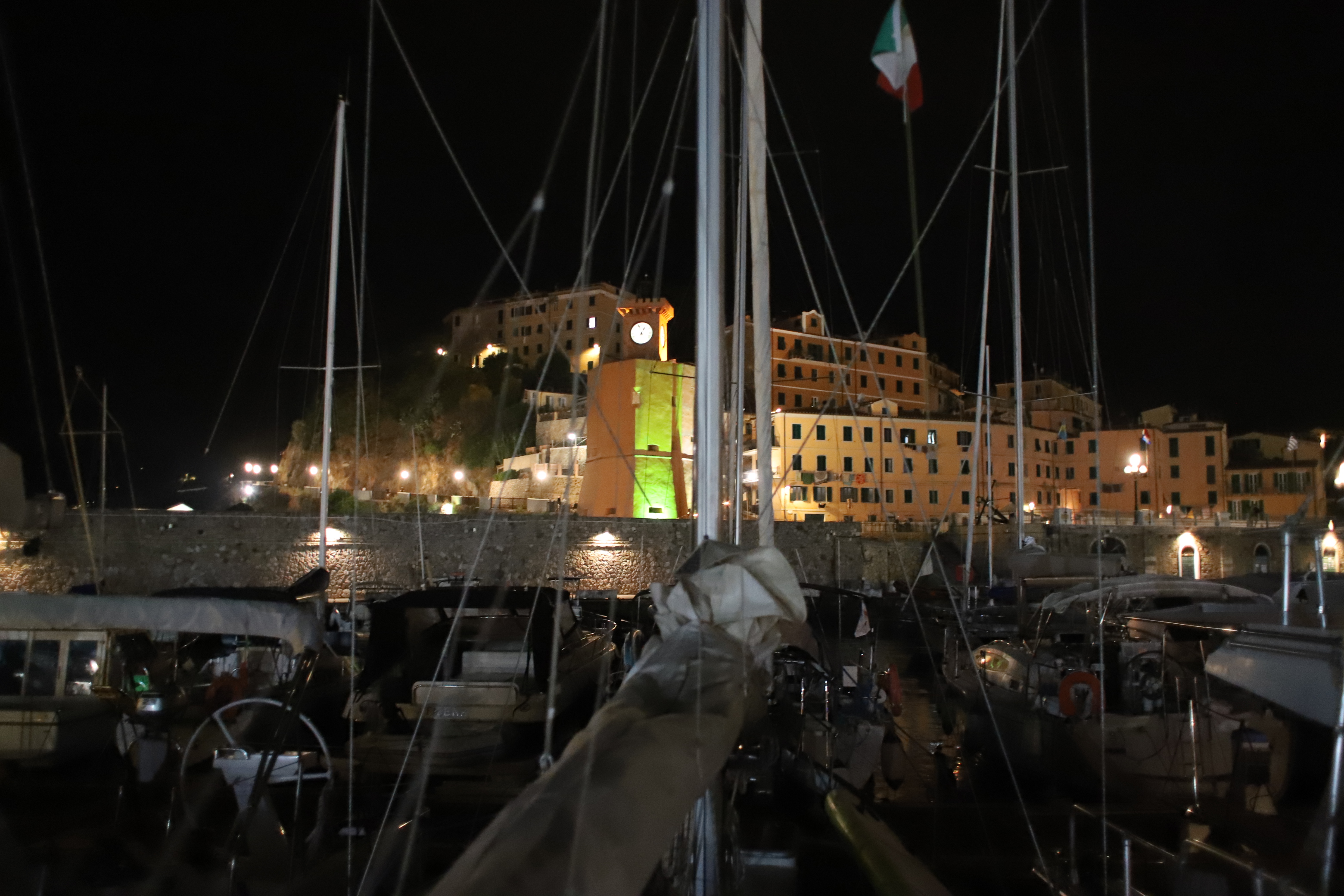 Bereits am zweiten Abend hat der Kapitän einen Plan für den nächsten Tag erdacht. Zum Leidwesen von Mamabert war es sein fester Wille, einen Gipfelsturm zu wagen. So gings am Tag drei für zwei Stunden bergauf, meist auf einem gemauerten Weg aus umliegenden Steinen, schön gemacht, von — sagen wir mal, Sklavenhand?? Ein Weg, auf dem Spartakus in Richtung Rom oder sonstwo getrieben wurde, erinnerte uns unzählige Male an einen klassichen Via Roma, wir glauben, dass der Name des Wegs jedenfalls so lauten musste. Davor gingen wir noch in die Uffici des Hafens, nach einem Wetterbericht fragen: Che tiempo fa, äh domani?? War die Frage, wir bekamen einen Wetterbericht ausgedruckt, gleich fragten wir noch nach der Tankstelle, gleich neben dem Büro. Ja, bis zum Sommer gibt es nur Self-Service. Ok, gracie. Perfekt. Aber dann schauten wir uns die Tanke an und stellten fest, dass die Hafenmauer unterhalb der Wasserlinie nach draußen sprang. Da bohrten sich also Steine in Ilvas Seitenwand, außer man hat Fender der Marke „Supersize“. Wollten wir Ilva damit bestrafen? Niemals!!!