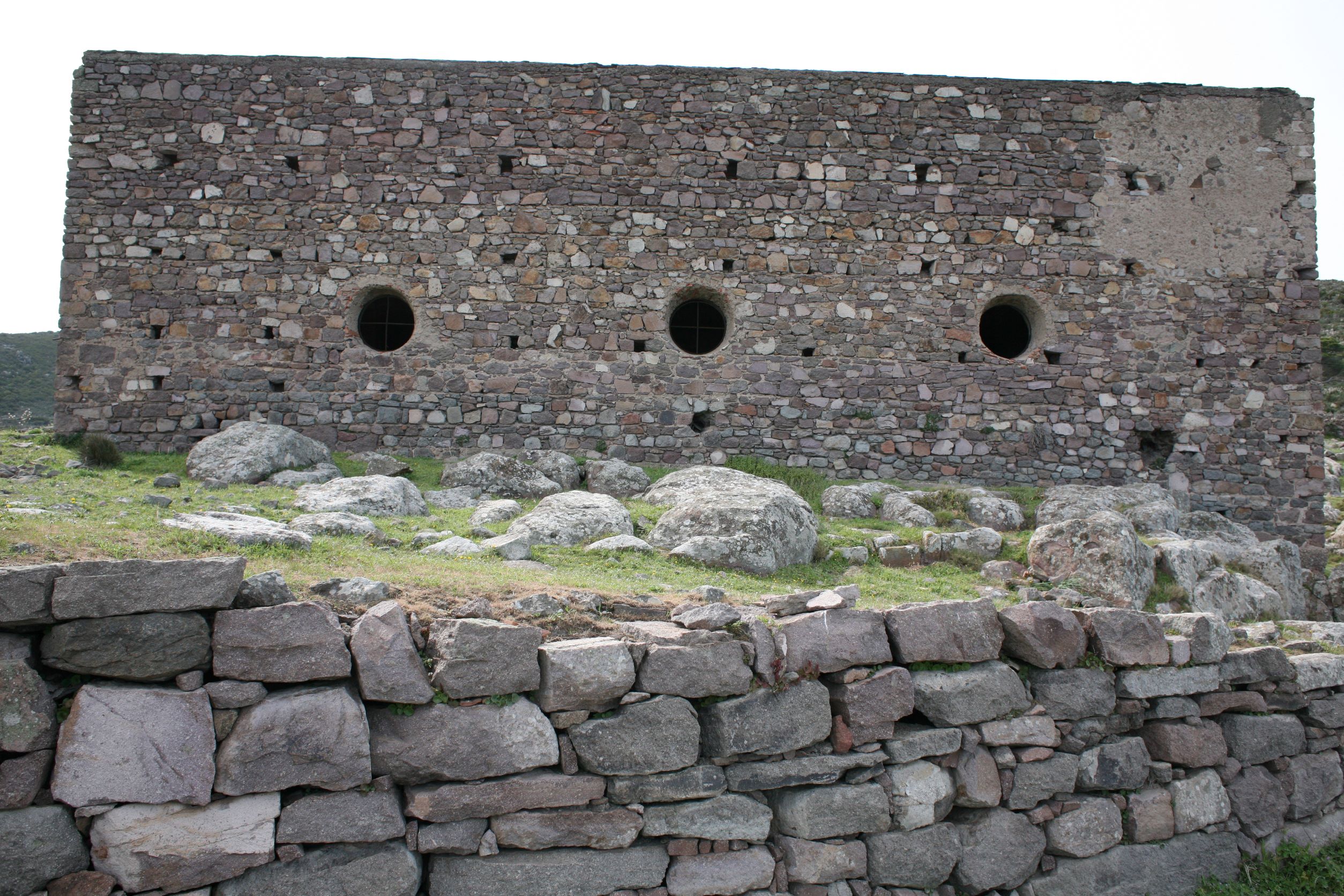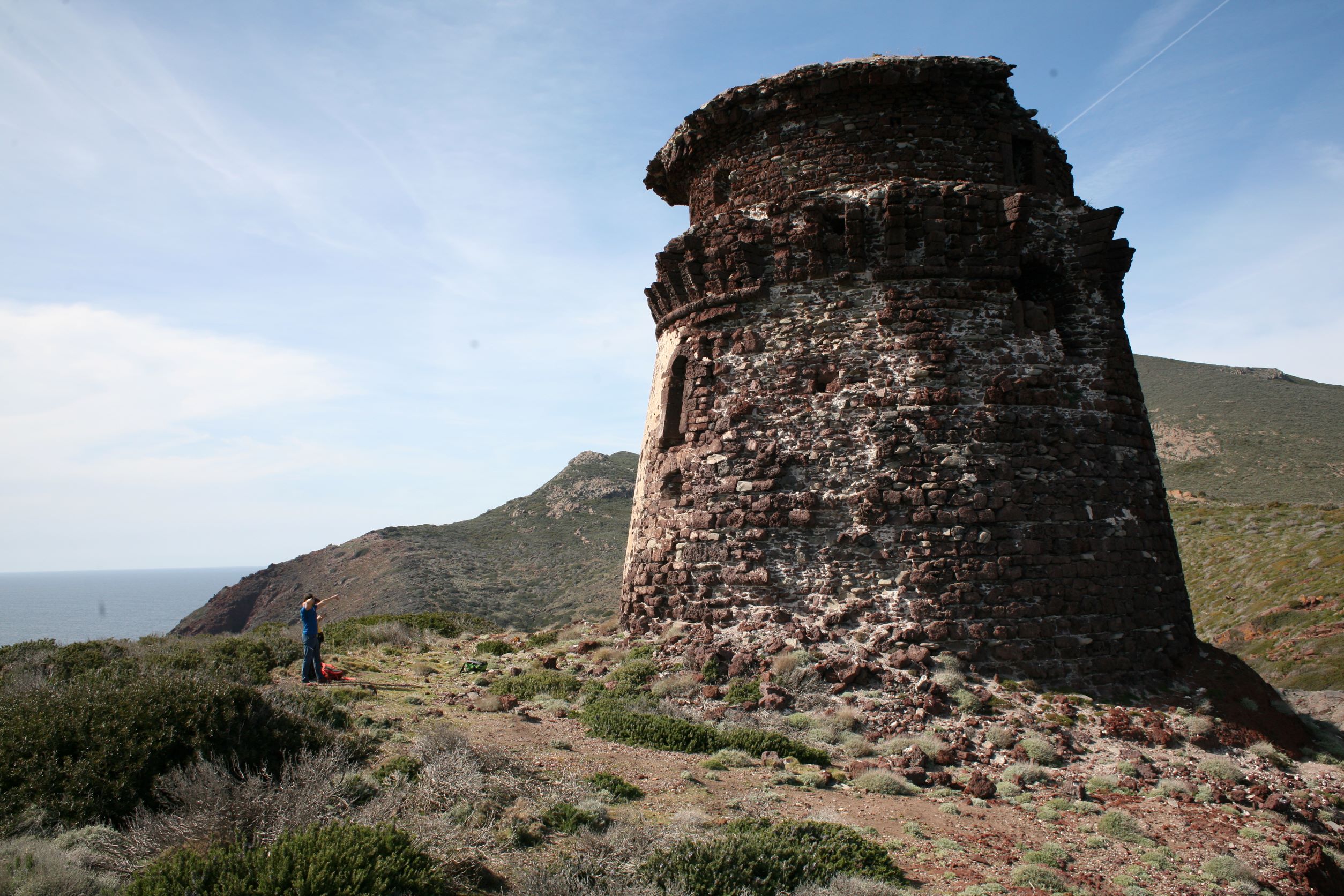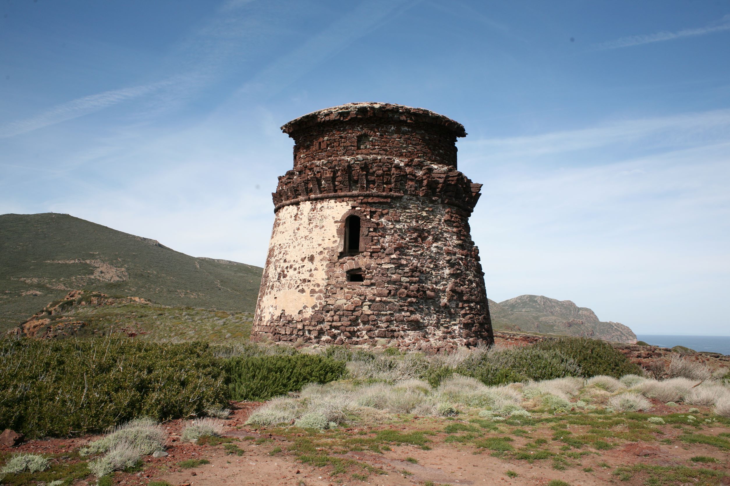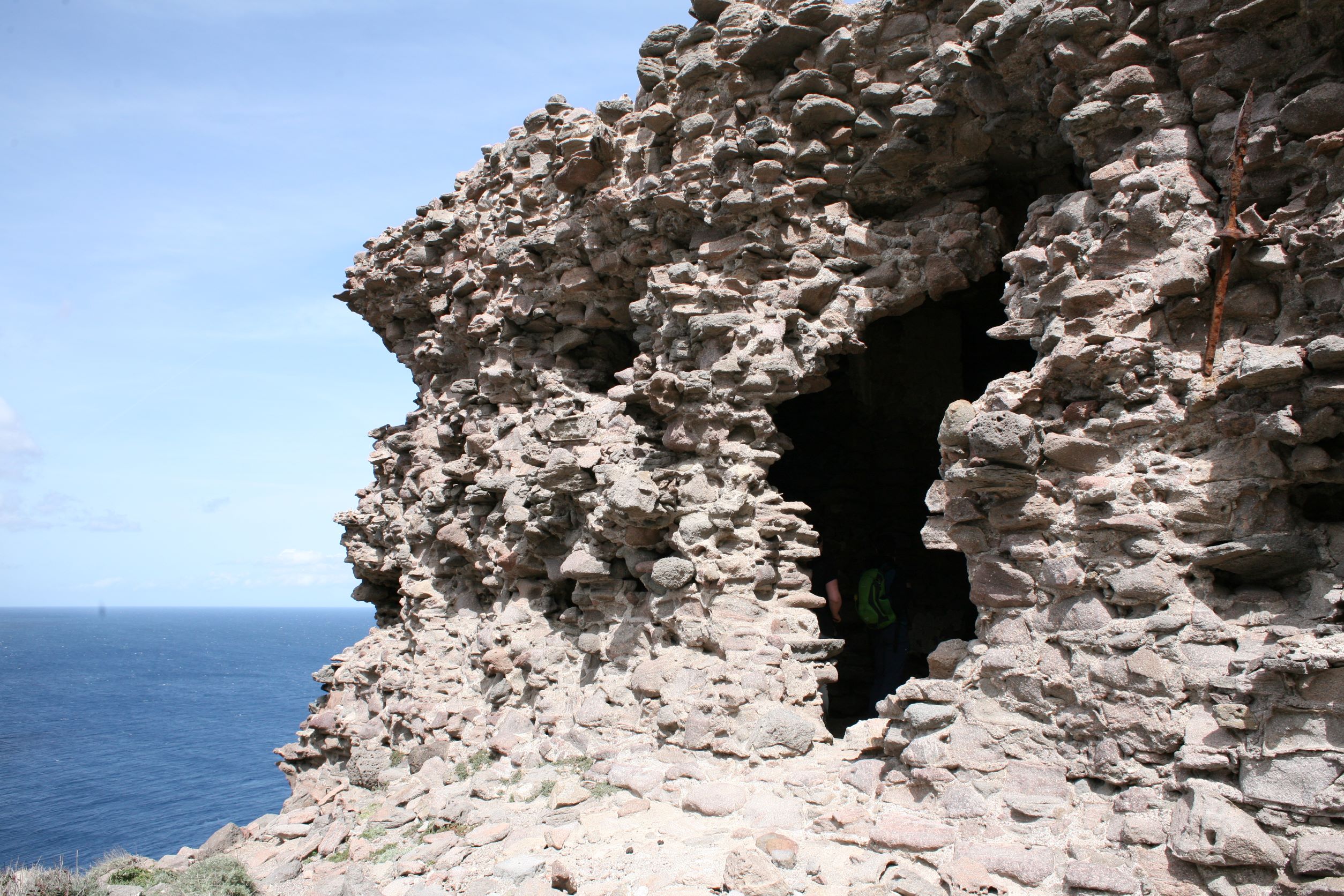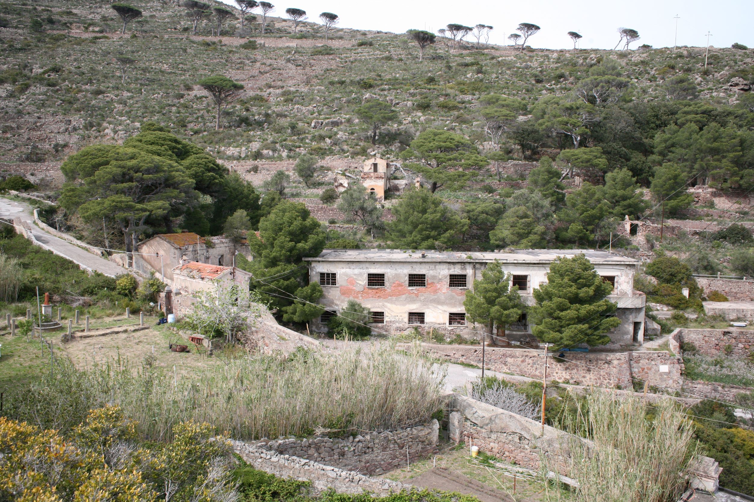 Das Leben auf einer Insel erscheint uns sinnlos, weil es in keinem Zusammenhang steht. Und Capraia steht mit dem Nichts in Zusammenhang. Ganz allein, es taucht einfach aus dem Nichts am Horizont auf wie die Osterinsel. Und dann, bist du erst mal da, fahren genau die selben Autos wie am Festland, nur, du weißt, eigentlich können die gar nirgends wohin fahren. Es gibt hier nur 800 Meter Straße!! Das hindert einen Ducatiheizer aber nicht, die Kurve entlang der Bucht mit einem Aufheuler zu nehmen, aber so richtig molto bene!! Das ist ausnahmsweise ein richtig witziger Aufheuler. Weil, so ganz ohne Zusammenhang!! Von oben, von den Bergen aus sieht man bis aufs Festland, bis nach Piombino, Elba Richtung Südosten ist genauso präsent wie Korsika im Westen, mit tief verschneiten Bergen. Fassungslos stehen wir am höchsten Punkt von Capraia in einer Kirche aus Stahlträgern, die der Wind und das Salz verrotten ließ. Teile aus Blech liegen weiter unten in der Böschung. Auf einer Broschüre steht, dass es eine Forschungsstation war. Mit solchen Fenstern?