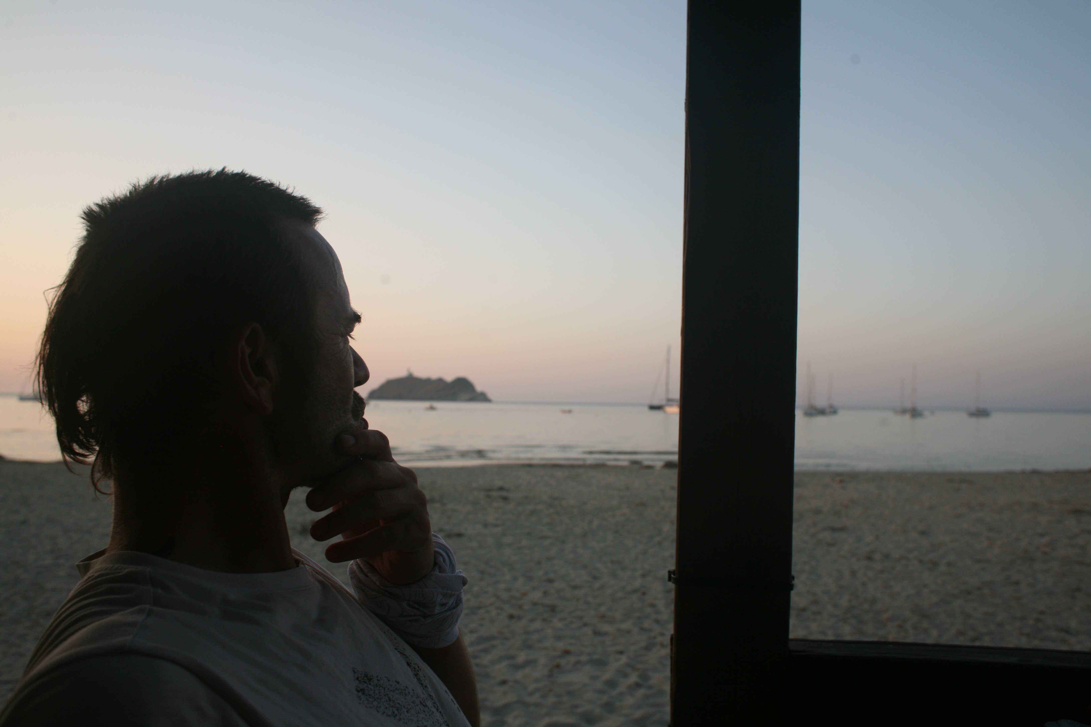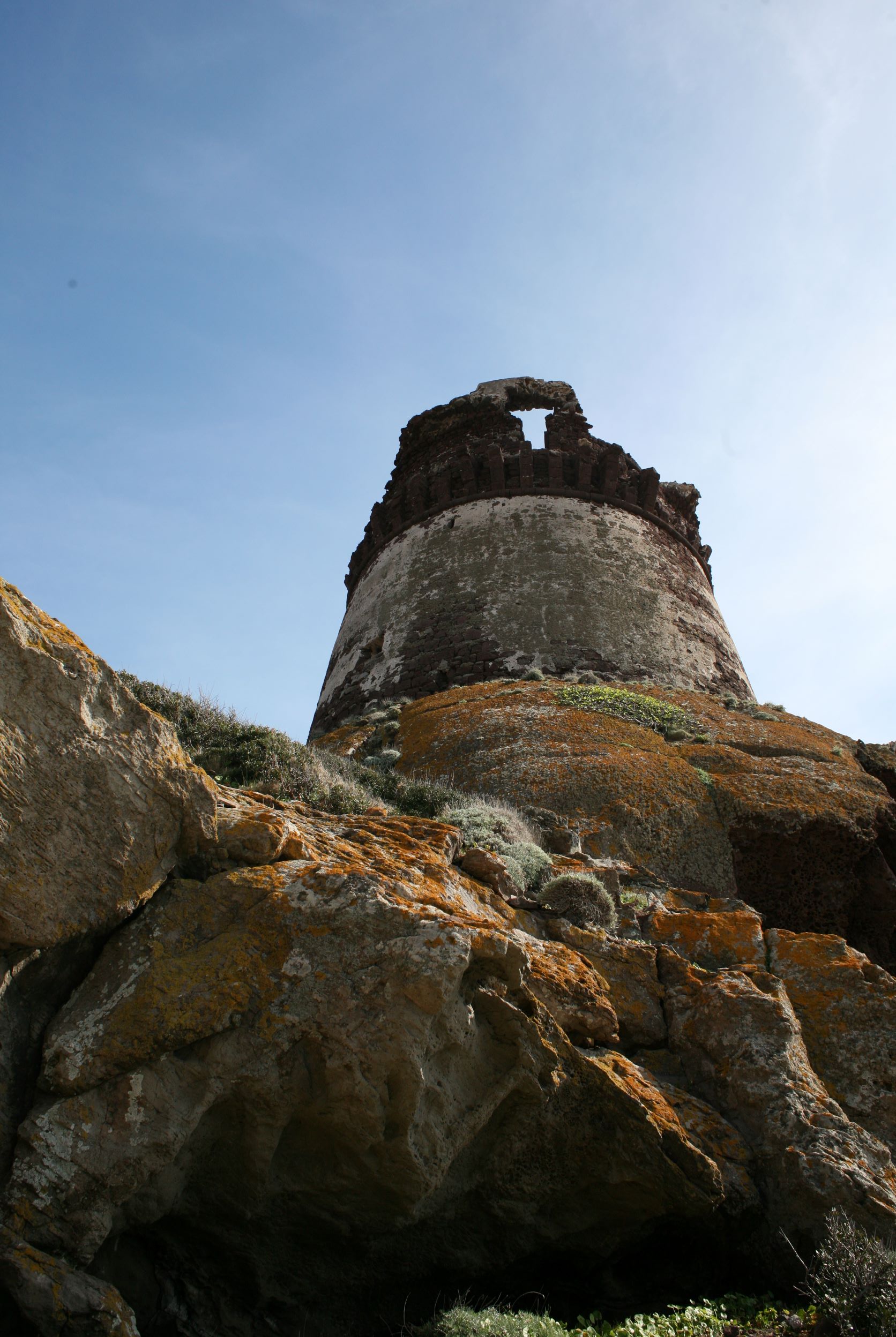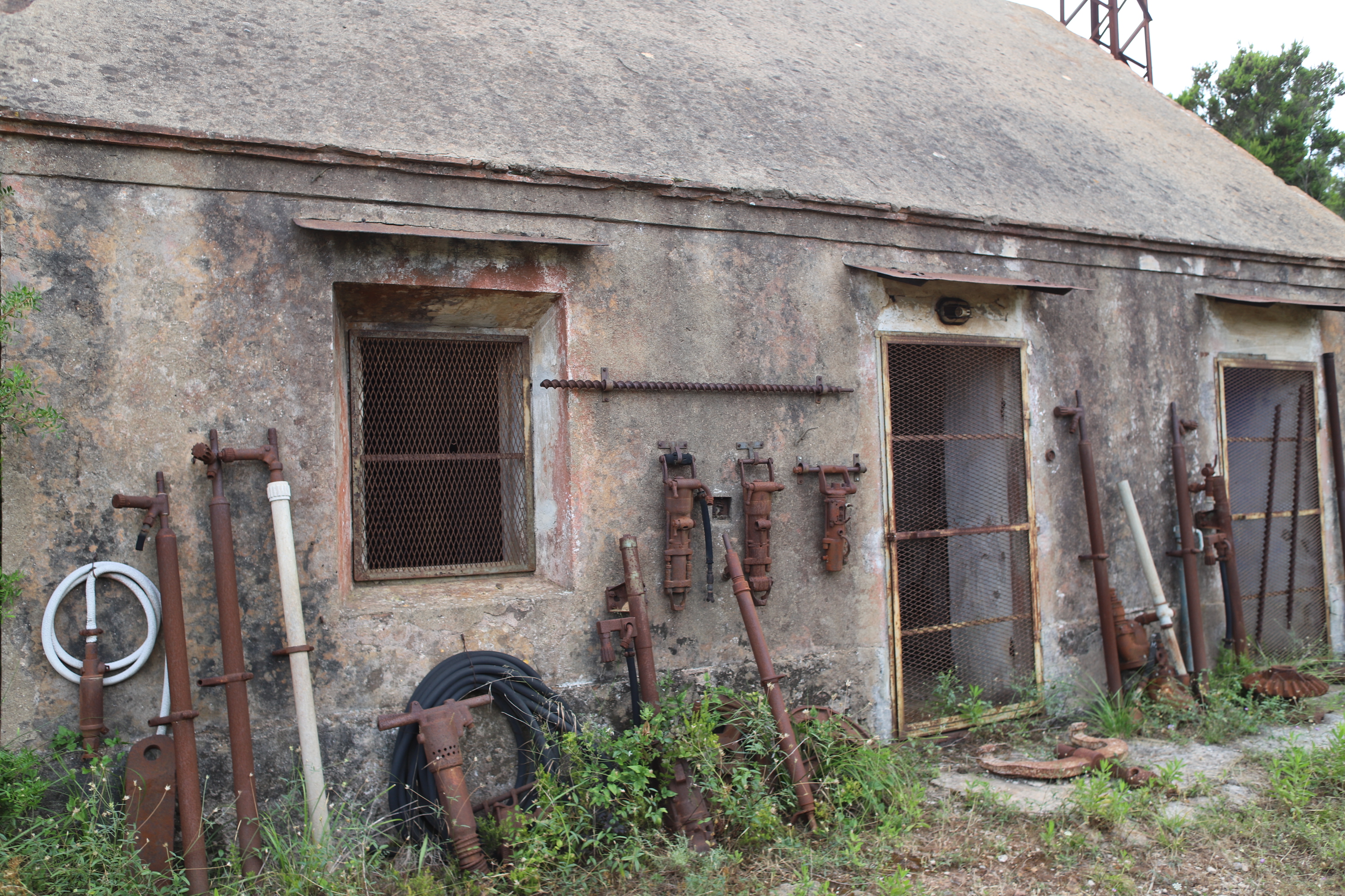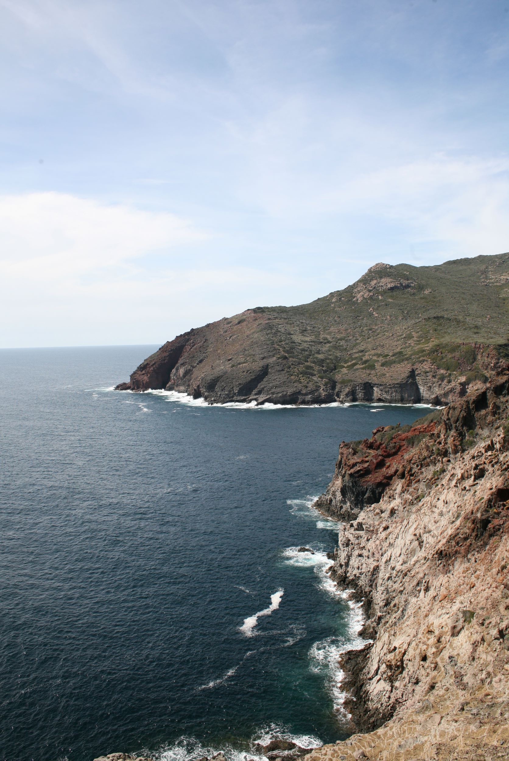 Das Leben auf einer Insel erscheint uns sinnlos, weil es in keinem Zusammenhang steht. Und Capraia steht mit dem Nichts in Zusammenhang. Ganz allein, es taucht einfach aus dem Nichts am Horizont auf wie die Osterinsel. Und dann, bist du erst mal da, fahren genau die selben Autos wie am Festland, nur, du weißt, eigentlich können die gar nirgends wohin fahren. Es gibt hier nur 800 Meter Straße!! Das hindert einen Ducatiheizer aber nicht, die Kurve entlang der Bucht mit einem Aufheuler zu nehmen, aber so richtig molto bene!! Das ist ausnahmsweise ein richtig witziger Aufheuler. Weil, so ganz ohne Zusammenhang!! Von oben, von den Bergen aus sieht man bis aufs Festland, bis nach Piombino, Elba Richtung Südosten ist genauso präsent wie Korsika im Westen, mit tief verschneiten Bergen. Fassungslos stehen wir am höchsten Punkt von Capraia in einer Kirche aus Stahlträgern, die der Wind und das Salz verrotten ließ. Teile aus Blech liegen weiter unten in der Böschung. Auf einer Broschüre steht, dass es eine Forschungsstation war. Mit solchen Fenstern?