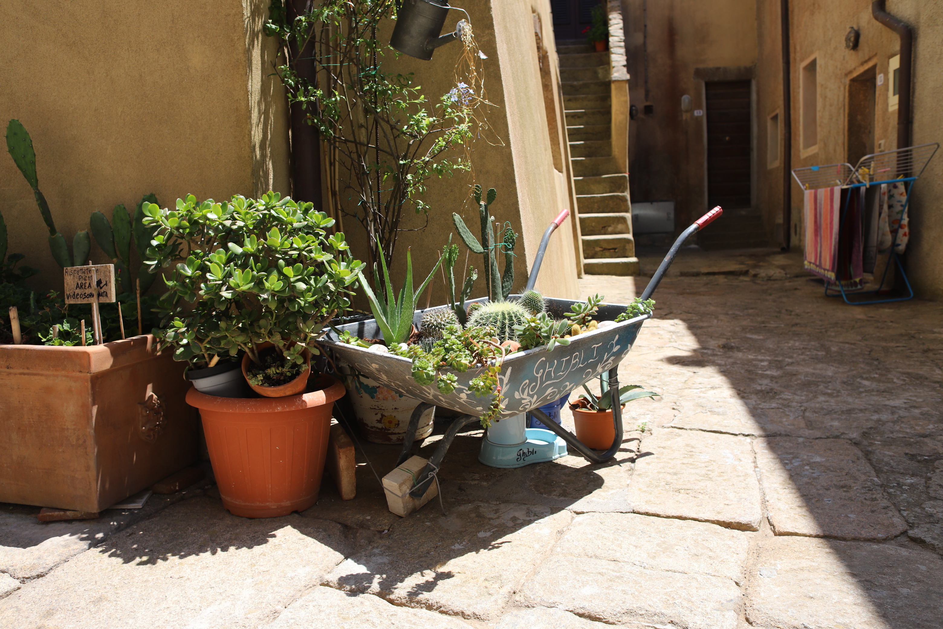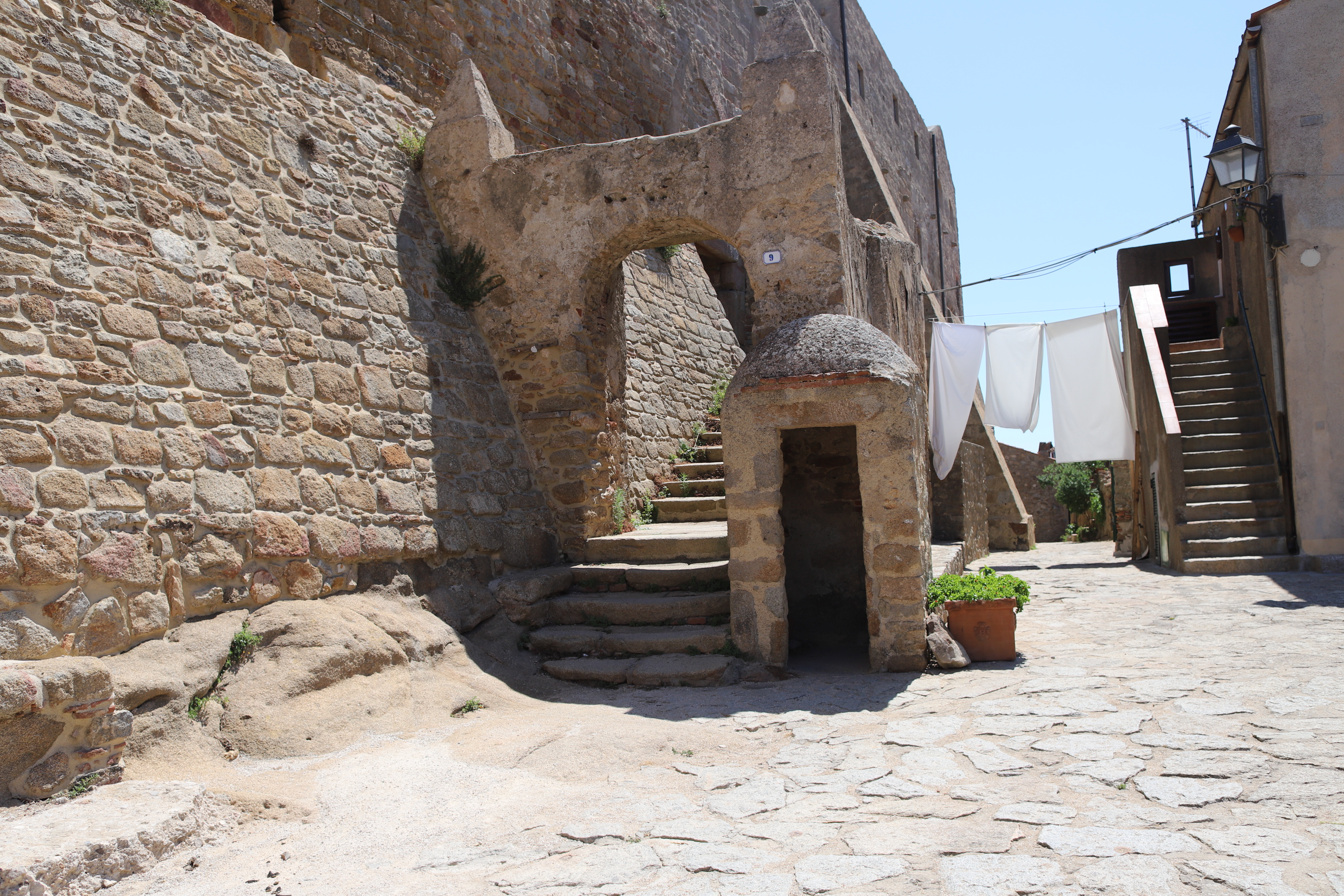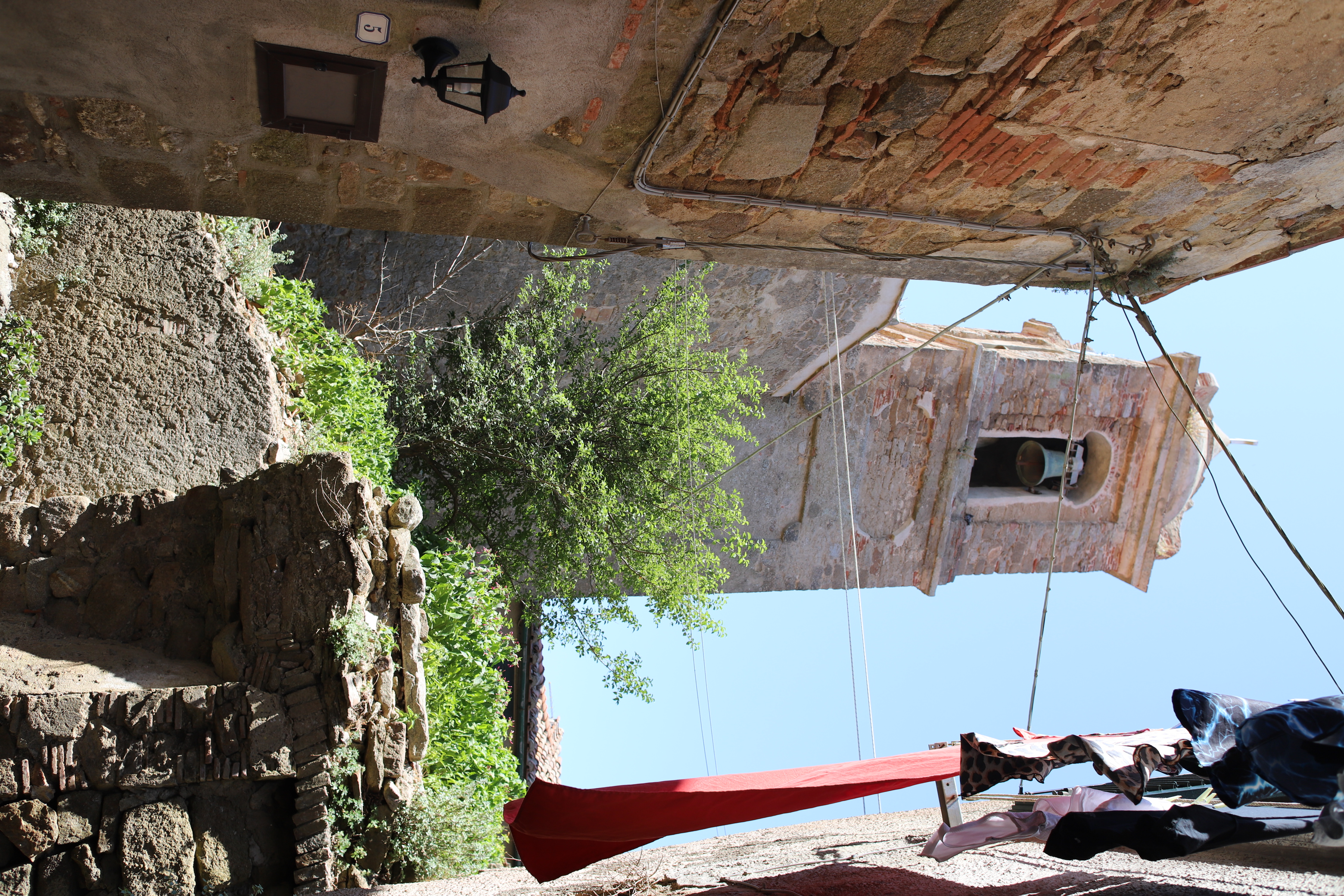 Dann gingen wir in den Ort, gleich links rauf bis zum Torre, und dann verzweigen sich die Wege, einer vorbei an der Polizeistation, mit Innenhof für mindestens zehn Einsatzwagen, und Wohnhäusern mit Balkon mit oder ohne schön gestalteten Stiegenaufgängen.