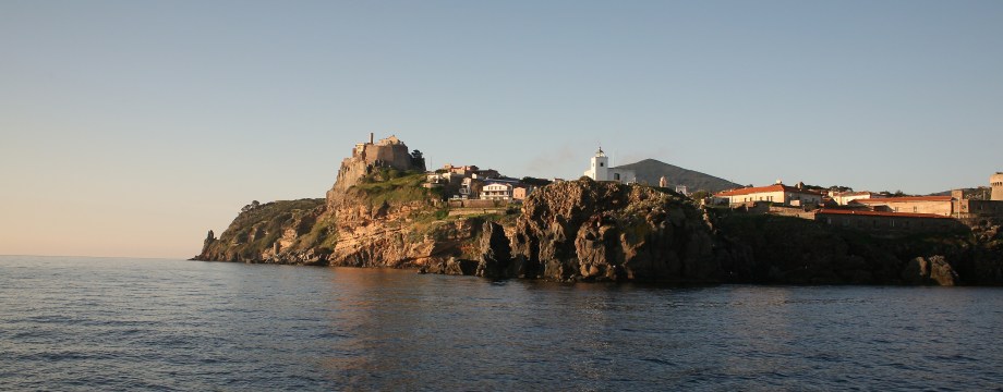 Das Leben auf einer Insel erscheint uns sinnlos, weil es in keinem Zusammenhang steht. Und Capraia steht mit dem Nichts in Zusammenhang. Ganz allein, es taucht einfach aus dem Nichts am Horizont auf wie die Osterinsel. Und dann, bist du erst mal da, fahren genau die selben Autos wie am Festland, nur, du weißt, eigentlich können die gar nirgends wohin fahren. Es gibt hier nur 800 Meter Straße!! Das hindert einen Ducatiheizer aber nicht, die Kurve entlang der Bucht mit einem Aufheuler zu nehmen, aber so richtig molto bene!! Das ist ausnahmsweise ein richtig witziger Aufheuler. Weil, so ganz ohne Zusammenhang!! Von oben, von den Bergen aus sieht man bis aufs Festland, bis nach Piombino, Elba Richtung Südosten ist genauso präsent wie Korsika im Westen, mit tief verschneiten Bergen. Fassungslos stehen wir am höchsten Punkt von Capraia in einer Kirche aus Stahlträgern, die der Wind und das Salz verrotten ließ. Teile aus Blech liegen weiter unten in der Böschung. Auf einer Broschüre steht, dass es eine Forschungsstation war. Mit solchen Fenstern?